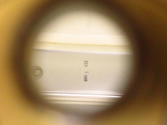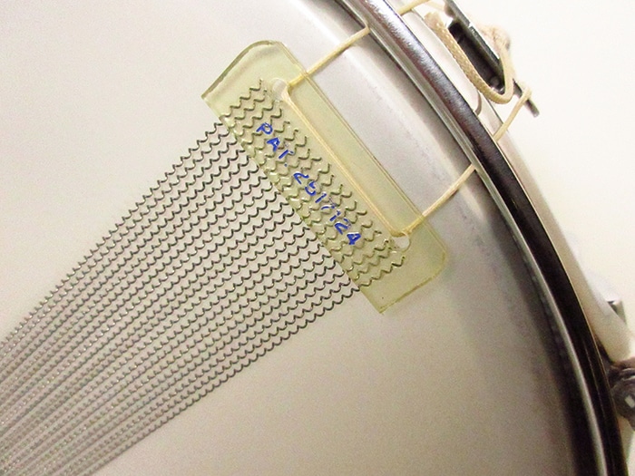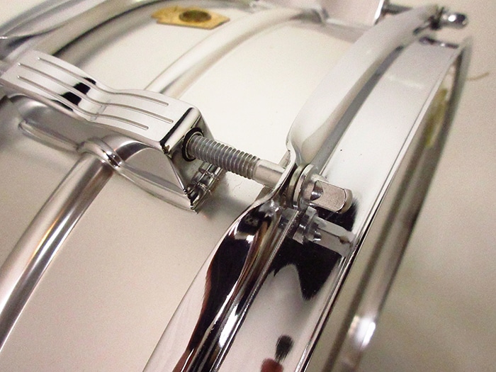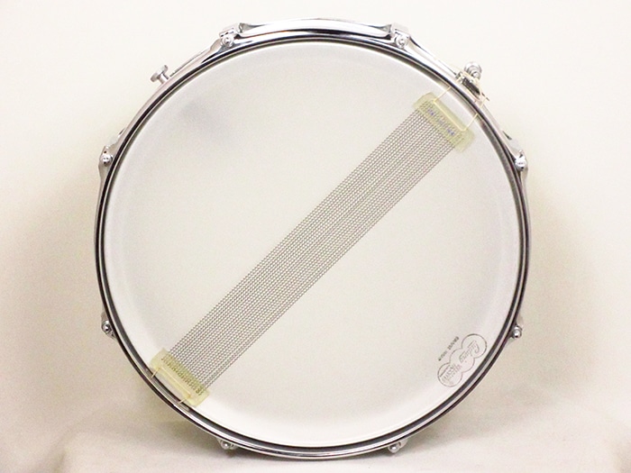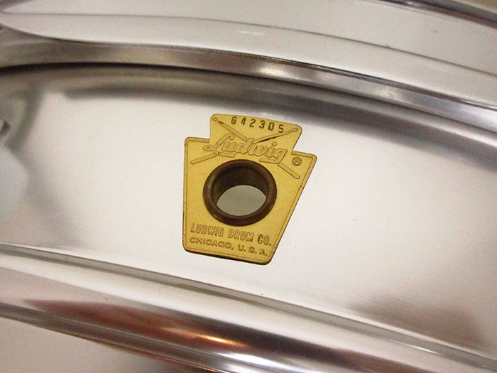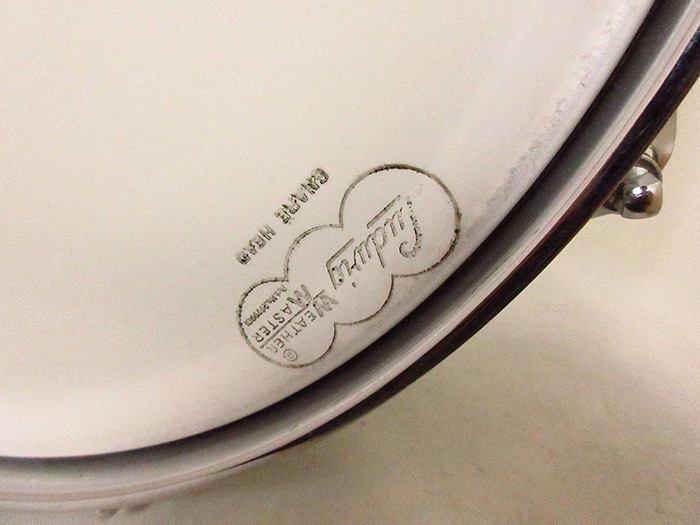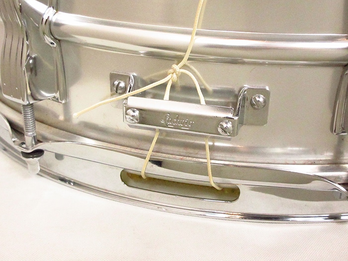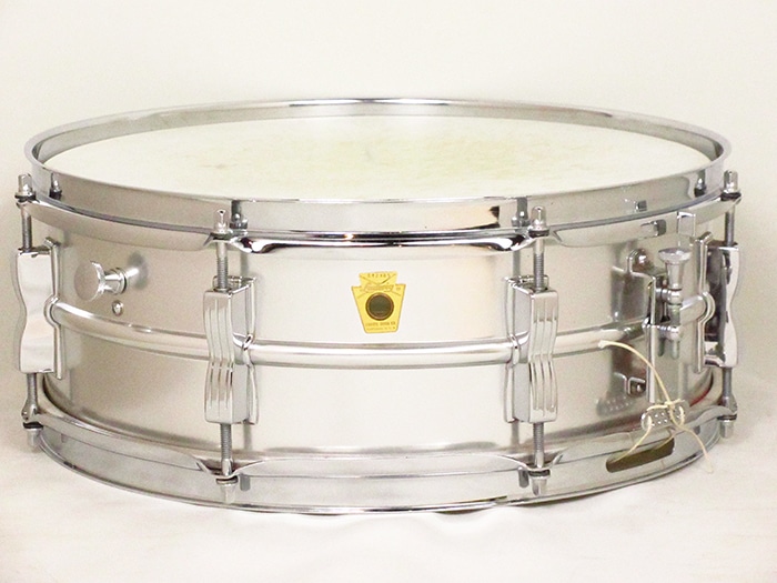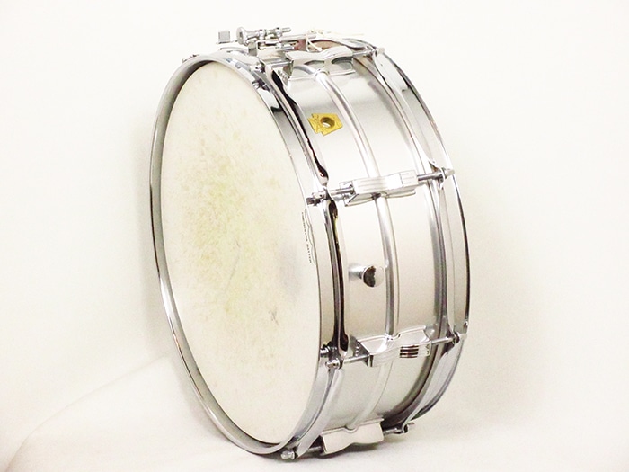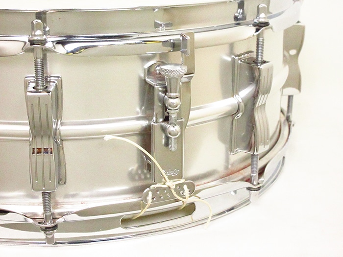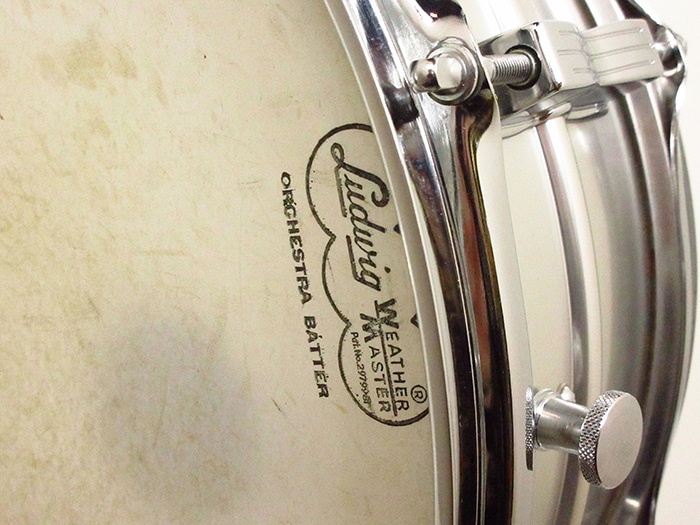 キーストーンバッジ装着、サイズは14"×5"インチ。シリアルナンバー(642305)、シェル内側にDATE STAMPがあり「SEP 5 1968」と押されています。テンションボルト、ブラスワッシャー、ワイヤーなど全てオリジナル、またヘッドはWEATHER MASTERのORCHESTRA BATTERとSNARE HEADが装着されておりオリジナル性の高さを誇っています。フープは1.8mmのオリジナルスティールフープが搭載されいます。アルミシェルを使用したアクロライトは明るく軽快なサウンドが特徴で、ビンテージ品は現行品に比べ柔らかなアタックを表現します。Ludwigスープラフォニックに並んで人気のあるメタルスネアです。