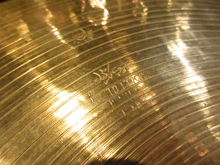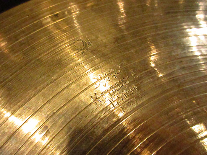 刻印より、トレードマークの星が小さく、かつ三日月に添って“Made in Turkey” と囲んでいており、アラビア文字が若干省略されたような刻印が1959年から66年に製造されたイスタンブールkジルジャンのシンバルです。