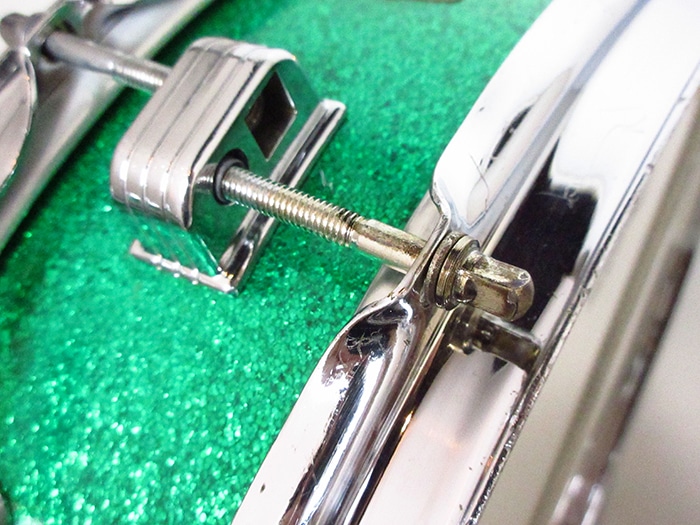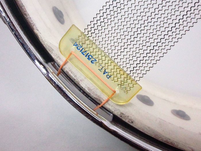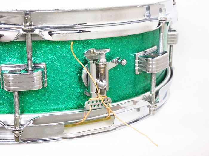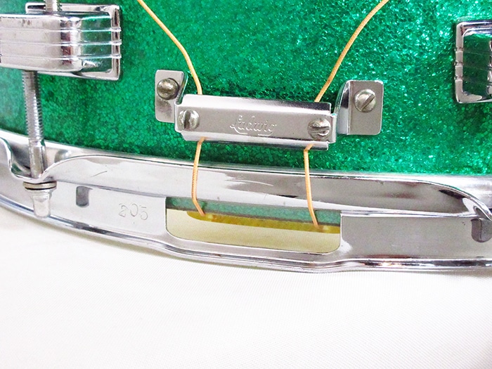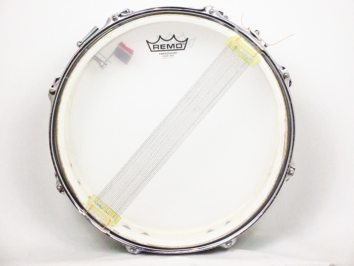 トップ、ボトム共にブラスフープ装着(ボトム側にやや歪みあり)、ストレイナースイッチ(P-84)、バット部(P-32)、スネアワイヤーはプラスティックエンド20本ワイヤーが装着しております。ヘッドはビンテージREMOのコーテッドアンバサダー、スネアサイドアンバサダー装着。