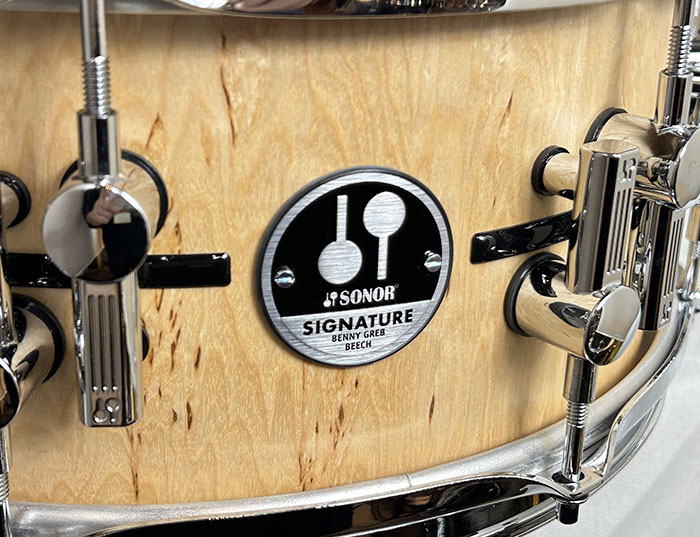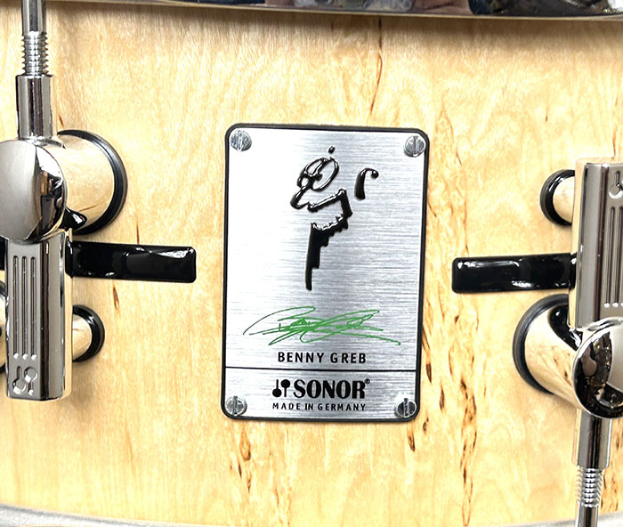 Benny Greb(ベニー・グレブ)は、1980 年ドイツ生まれのドラマーで、プロ・ミュージシャンとして活動開始以降、世界各国のドラム・フェスティバルに出演。その卓越したテクニックとバックビートが世界で評価され一躍脚光を浴びます。ソナー社で特注品としてベニー・グレブ氏に譲り受けていた物をそのまま製品化しました。ベニーサウンドをつくるため、サイズは13"×5.75"と特殊な構成に、またシェルアウターに樹脂製のセンターリングを施しシェル鳴りを程よく抑え、シンセティックなサウンドメイクを再現します。またエンブレムにはベニーの横顔のイラストが入っています。