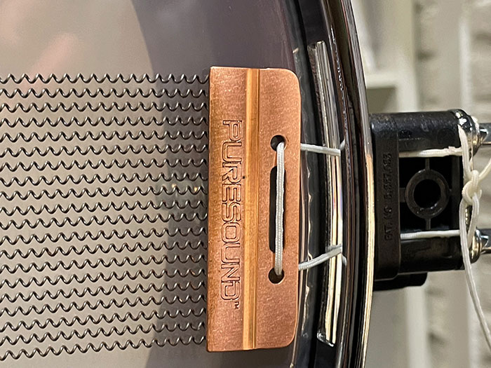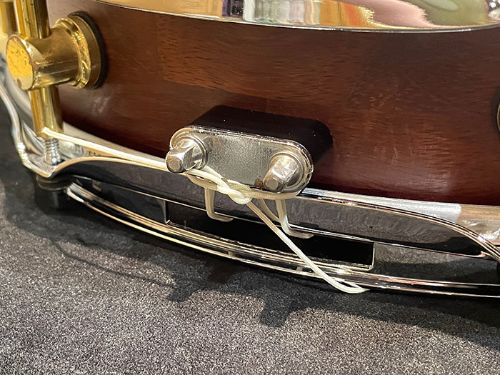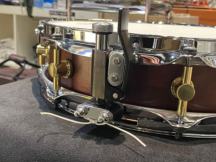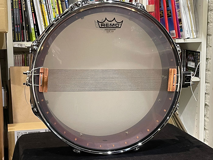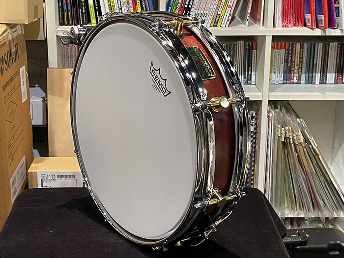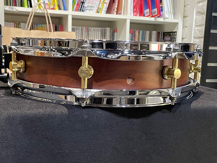 こちらは貴重なアフリカ産の硬いパドゥク材を使用したモデルです。ダークでレスポンスの早いスネアサウンド、ラウドな印象です。
