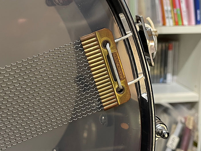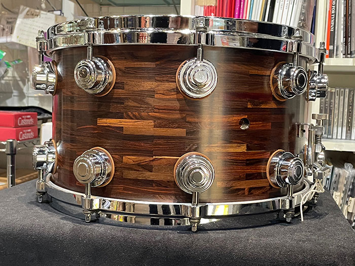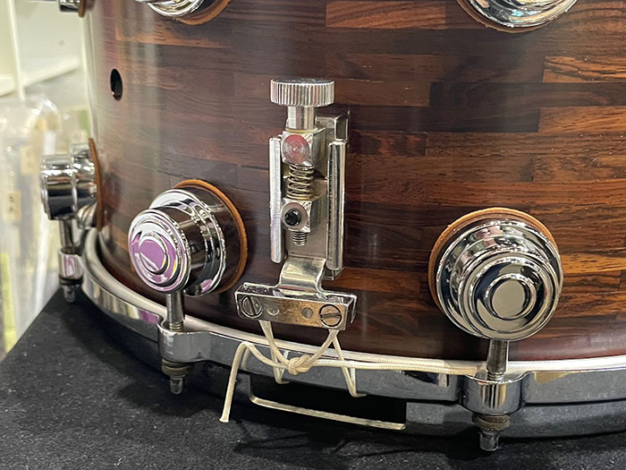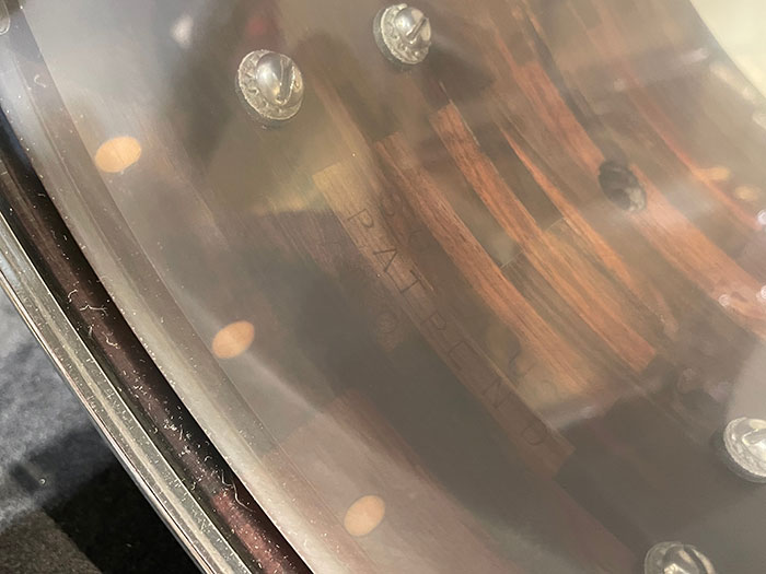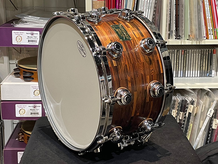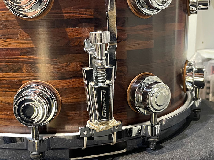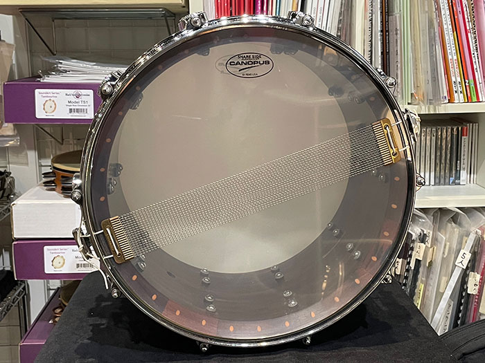 元々の接着剤は最小限に抑え、木材をあらゆる方向から800kg以上の圧力をかけ続けて組み立てたそうです。Canopusは以前Sotaと取引があったらしく、シェルを購入して自社のエンブレムを付け、DWラグ、Ludwigストレーナー、ノーブランドのダイキャストフープが取り付けれています。