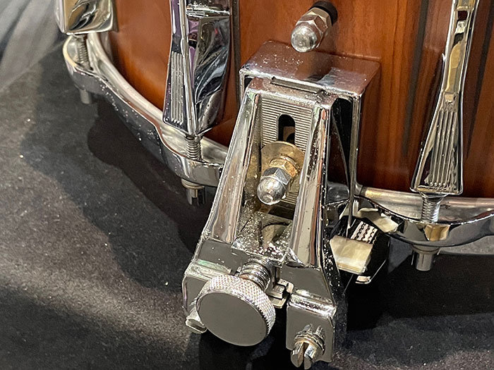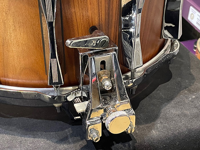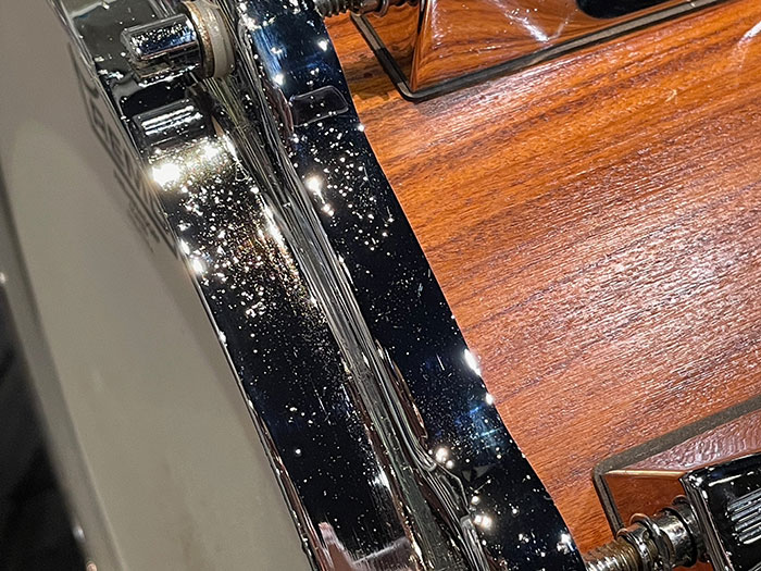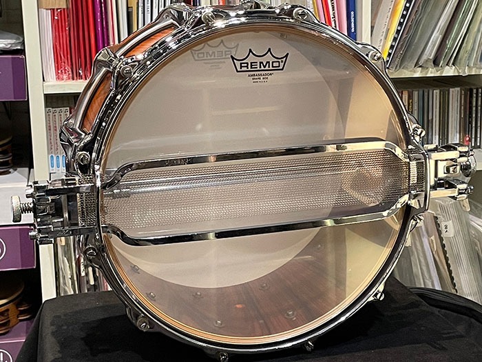 7mm12プライとソナーラインナップの中では薄めのシェルを採用、フープはオリジナルで亜鉛ダイキャスト12テンションフープが付いています。スナッピーワイヤーもオリジナルでフェローマンガンスティールワイヤー24本全面当たりでヨレはありますがまだご使用できます。パラレルアクションストレイナーバット部のワイヤー調節ダイヤルも問題なくご使用できます。