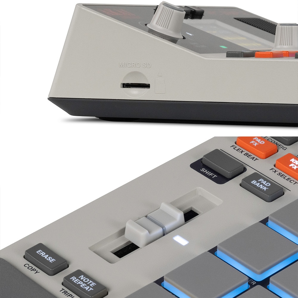 MPC Sampleは、クリエイターに必要なストレージ及び接続オプションを備えています。充電式リチウムイオン電池、microSDカードストレージ、オンボードシーケンサー、内蔵マイク、内蔵スピーカー、USB-C接続により、パソコンやDAWを使わずに外出先や移動中でも簡単に音声を録音、編集、再生できます。