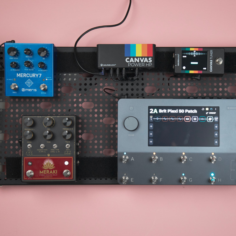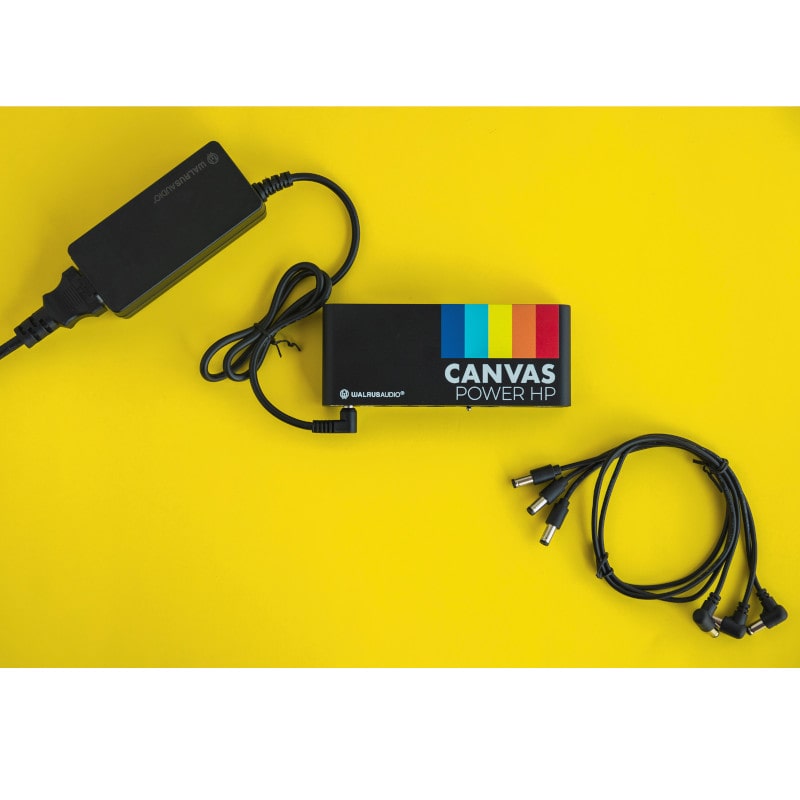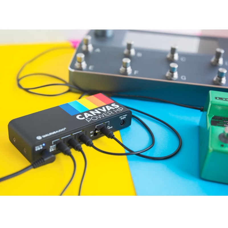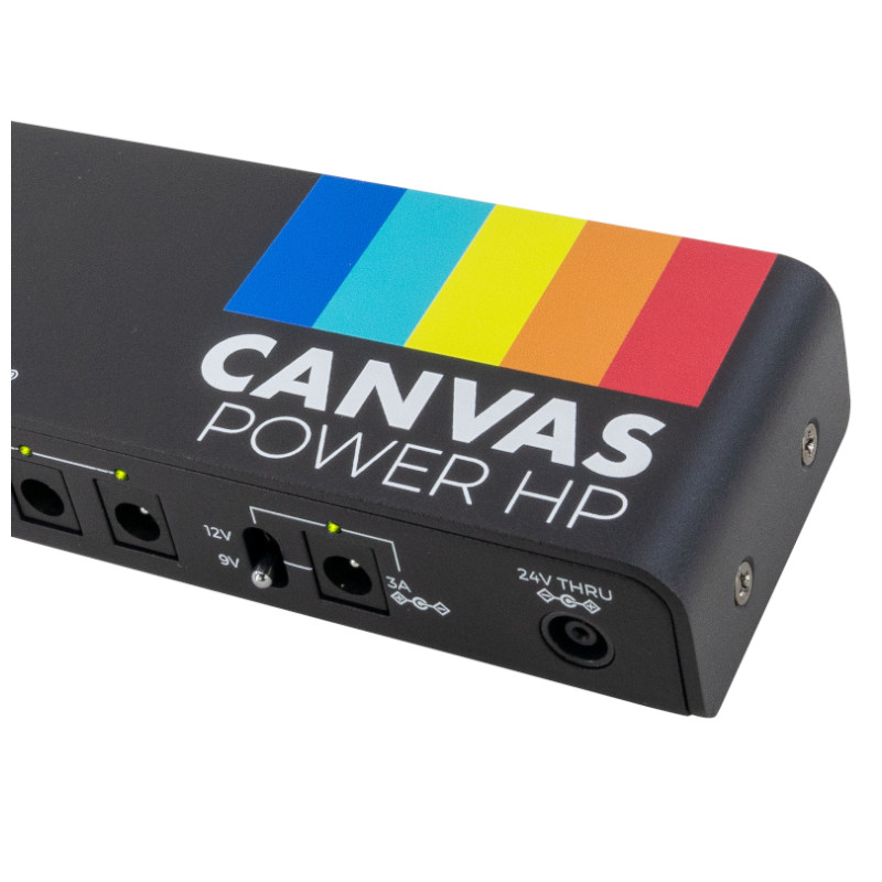 低ノイズ、高出力、スリムなデザインで高評価を得ているCanvas Powerに新たに、なんと3A出力も持つCanvas Power HPがラインナップ。3A という大容量の出力で、大きな電力を消費するモデラーやマルチエフェクター、高出力ペダルに電力を供給できます。また、この3A出力は高電圧ペダルに電力を供給するために9Vと12Vを切り替えることもできます。その他3つの独立した電源出力があり、9Vで最大500mAのクリーンな電力を供給します。