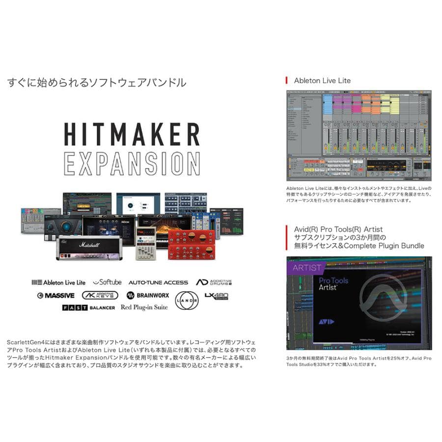 ScarlettGen4にはさまざまな楽曲制作ソフトウェアをバンドルしています。レコーディング用ソフトウェアPro Tools ArtistおよびAbleton Live Lite(いずれも本製品に付属)では、必要となるすべてのツールが揃ったHitmaker Expansionバンドルを使用可能です。数々の有名メーカーによる幅広い