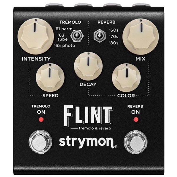Flint は一方にトレモロ、もう片方にリバーブを搭載し、それぞれ3種類のアンプから選ぶことができます。コントロールに搭載されたSPEED ノブは、さらにスローなトレモロを再現できるよう LFO 周波数のレンジが 1Hz 近くまで拡張されています。