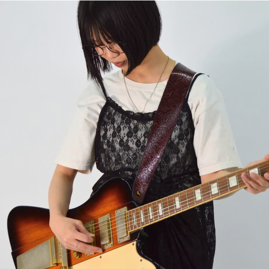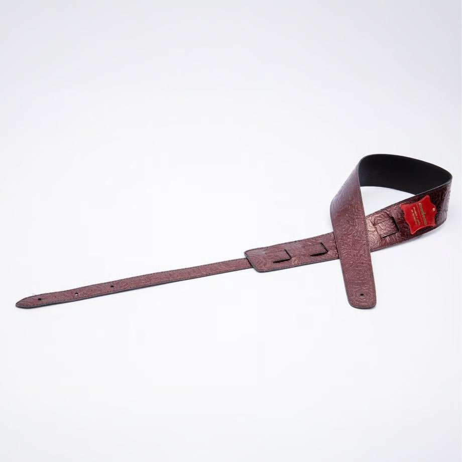 エンボス仕様のボタニカルローズ模様がギターに映える、目に美しいレザーストラップ。