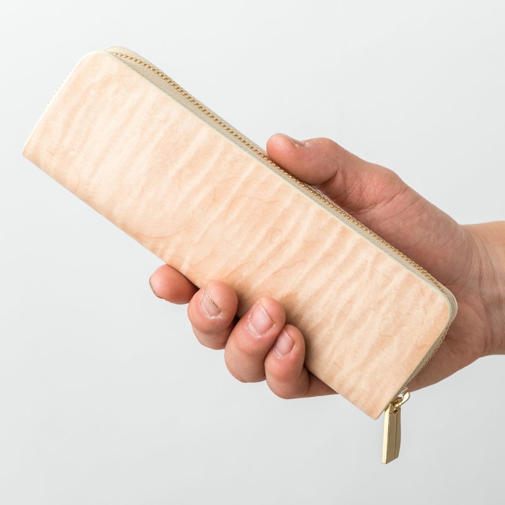 カーリーメイプルによる木材の質感、ヌメ革の革の質感、そのどちらもあなただけの色に染まっていく様子をお楽しみください。