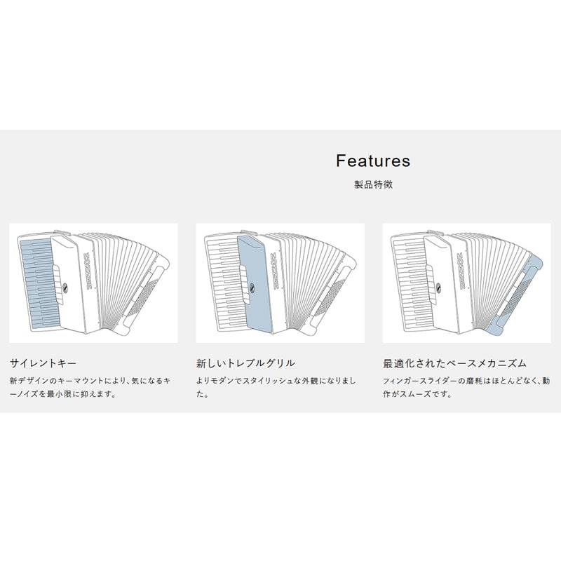 ステージパフォーマンスからオーケストラでのプレイまで、あらゆる演奏に対応可能です。 これからアコーディオンの世界へ踏み出す最初の一歩に最適なモデルです。 演奏後のお手入れの必需品、クリーニングクロスプレゼント! 【特徴】 「BRAVO(ブラボー)」シリーズは、初心者の方にもアコーディオンの音色が楽しめるように設計されています。 小型の「BRAVO II 48」から大型の「BRAVO III 120」まで7種類があり、どのモデルもとても軽く、音域やベース数もバリエーション豊かです。 さらに、グリル、レジスターボタン、鍵盤のタッチノイズを抑えたサイレントキーなどの改良が加えられています。 「BRAVO III 80」は、アコーディオンに必要なものをすべて備えています。ステージパフォーマンスからオーケストラでのプレイまで、あらゆる演奏に対応可能です。 これからアコーディオンの世界へ踏み出す最初の一歩に最適なモデルです。 【スペック】 ■ピアノ・キー数:37 ■音域:F - F ■トレブル リード / レジスター(スイッチ):3 (MML) / 5 (7) ■ベース・ボタン数:80 ■ベース リード / レジスター(スイッチ):4 / 3 ■サイズ(奥行×高さ):185mm×440mm ■重さ:8.6kg ■リードプレートクオリティ:standard ■カラー:ブラック、レッド ■付属品:ストラップ、ギグバッグ 【ご注意事項】 こちらの商品はメーカーにて調整、検品したものを取り寄せとなります。 ご注文いただき次第、納期を確認し、ご連絡を差し上げます。 日時指定希望がおありの場合はその際におうかがいさせていただきます。 だいたい、ご注文(支払決済確認) から1週間〜10日前後のお届け予定ですが、祝祭日やメーカー夏期、冬期休業期間等で、それ以上のお時間を頂戴する場合もございますので、 あらかじめご了承くださいますようお願いいたします。