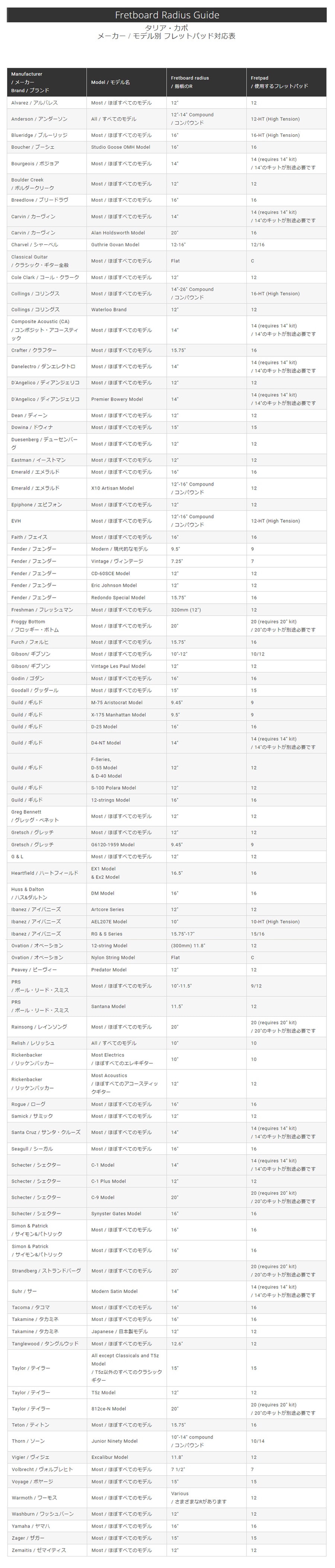 フレットパッドのラディアス (R)には「0" for Classicals, 7.25", 9.5", 10", 12", 15", 16"」の7種類があり、『スタンダード・テンション』と『ハイ・テンション』の計14種類。