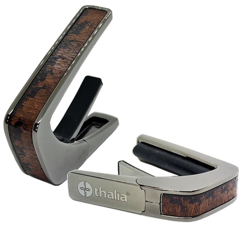 『Thalia Capos / タリア・カポ』は従来のカポとは一線を画す、見た目にも豪華なエキゾチック・ウッドやエキゾチック・シェル、彫刻や筐体のメッキ / フィニッシュ / カラーを採用したデザイン性に優れたモデルがあり、また、見た目のみならず機能面に関しても、通常のカポタストのように、使うギターの種類に合わせて1つずつカポを持ち替える必要がなく、フレットパッド(別売)をギターに合うものに交換するだけで簡単に、常にパーフェクトなテンション感とピッチ感で演奏する事を実現しました。