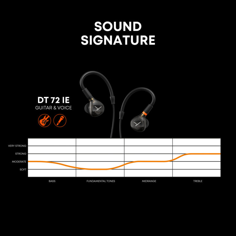 DT 72 IEは、最高のパフォーマンスを求めるギタリストやシンガーのために設計されています。控えめな低音と透明感のある低中音域を備え、閉塞効果を補正します。強調された中高音域がギターやボーカルの存在感を際立たせ、高音域が輝きを加えます。全体として、DT 72 IEはバランスの取れたクリアなサウンドを提供します。