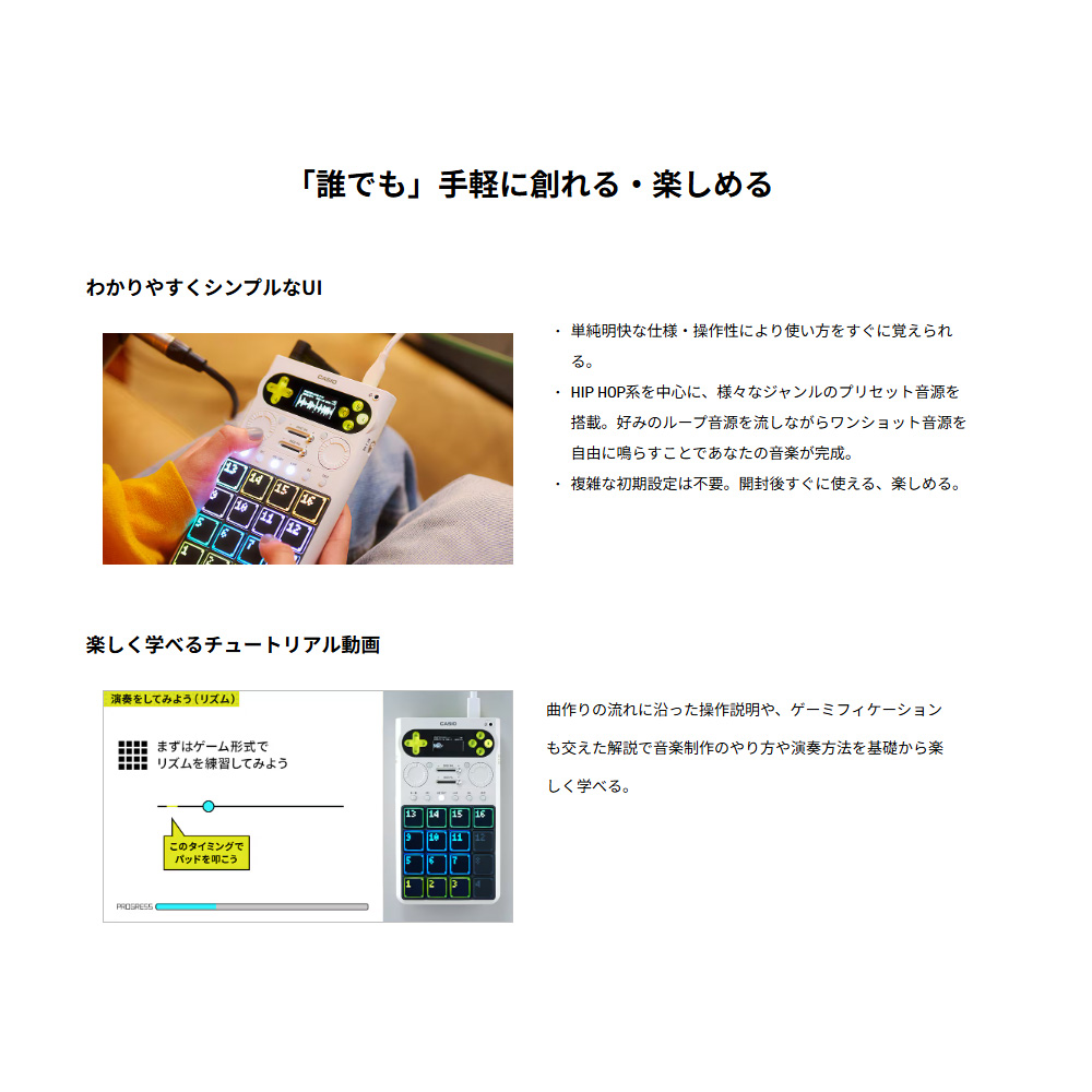 誰でも音楽制作・演奏が楽しめるスタンドアロン型サンプラー。直感的な操作性に加え、プリセット音源やチュートリアル動画で初心者の方でも簡単に使用可能。軽量・コンパクトボディでどこでも思いのままに自己表現。SK-1やMT-40といったカシオの名器音源も一部プリセット音源に入っているため長年のユーザーのクリエイティビティも刺激します。