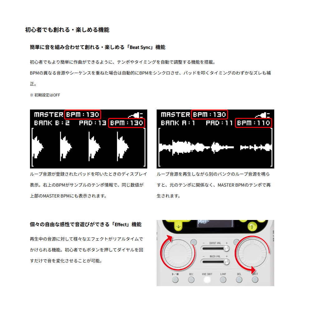 シーケンサー:16トラック×16ステップ×1~8小節、リアルタイム入力 / ステップ入力、バンク数:50バンク