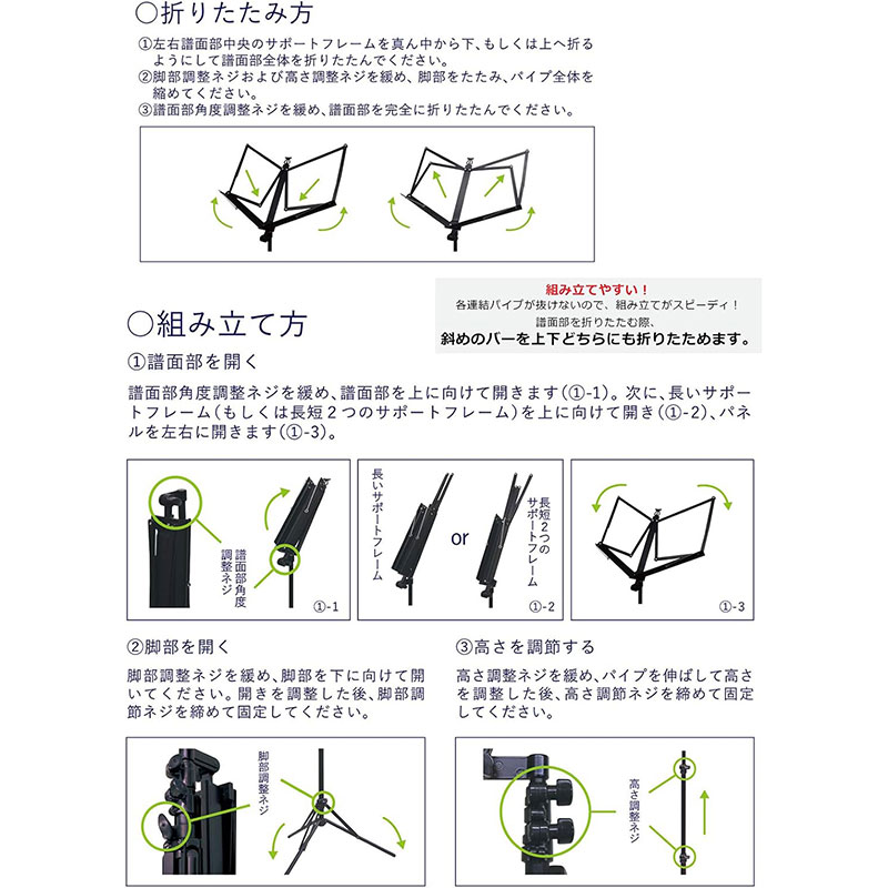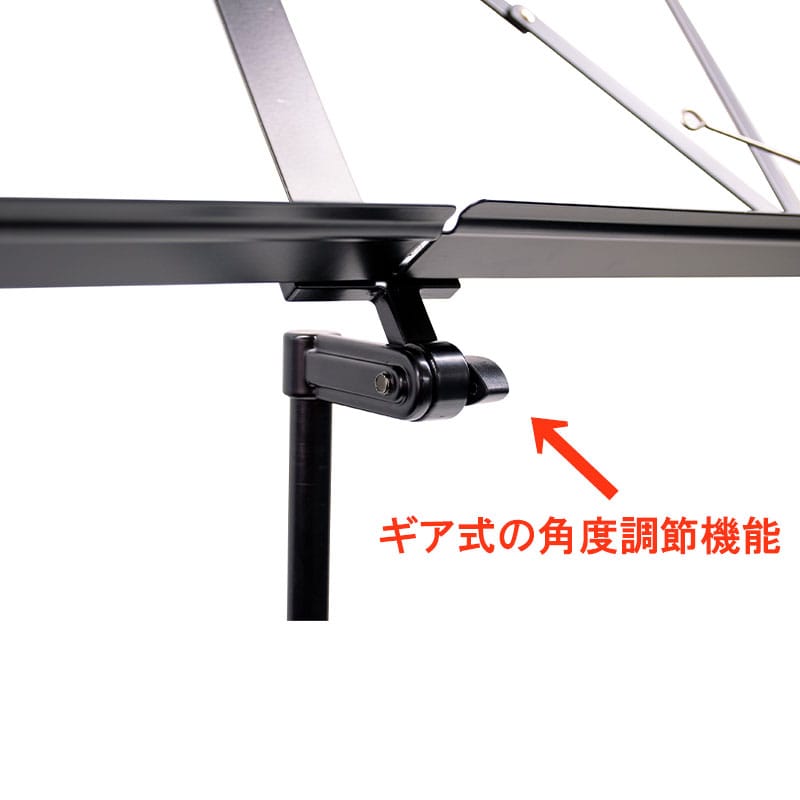譜面部にはギア式の角度調整機能を採用。奏者にちょうど良い角度で固定できます。譜面部はサポートバーと譜面おさえアームを備え大きなサイズの楽譜にも対応。