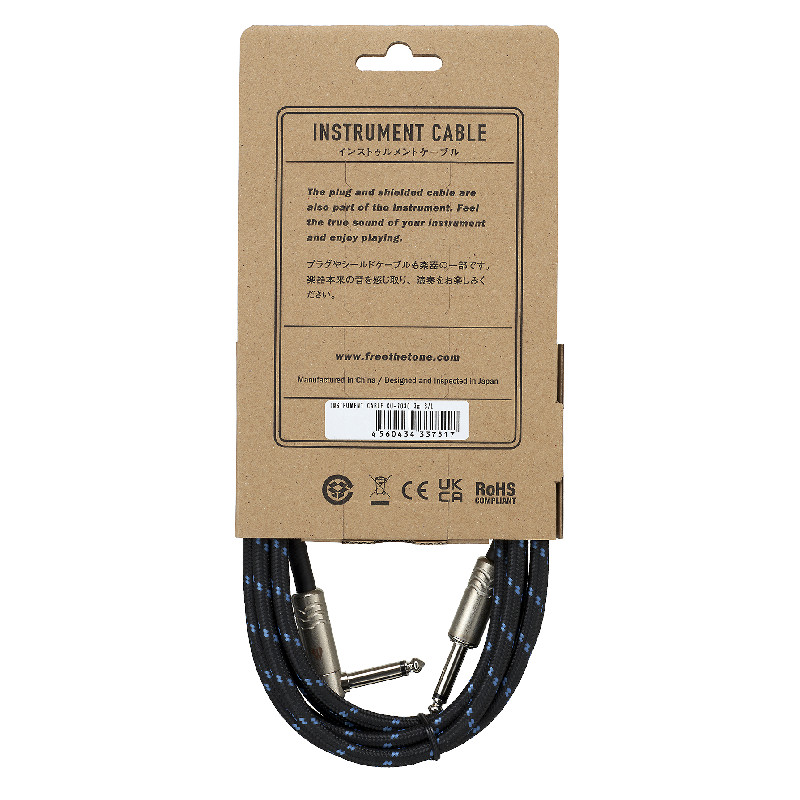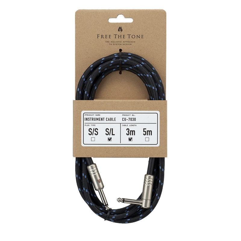CU-7030 は、遂に辿り着いた心地良いサウンドを持つ楽器用シールドケーブルです。ブラックにブルーの差し色を入れた保護スリーブと、フリーザトーン独自の波マークが入った亜鉛合金(ジンクアロイ)製のプラグキャップが特徴です。