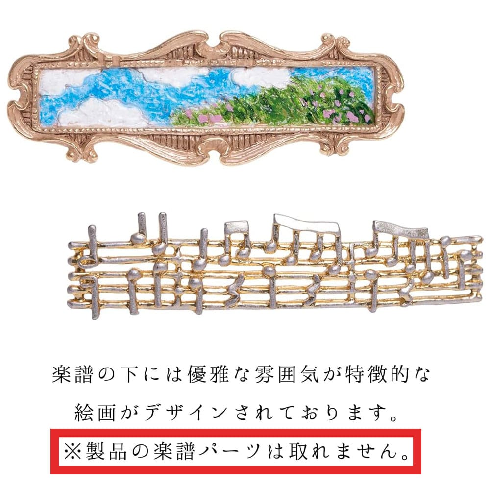 楽譜越しに覗く風景画には爽やかな青空とほのかに揺れる草木が描かれ、のどかで優雅な情景を窓から眺めているような印象を与えます。