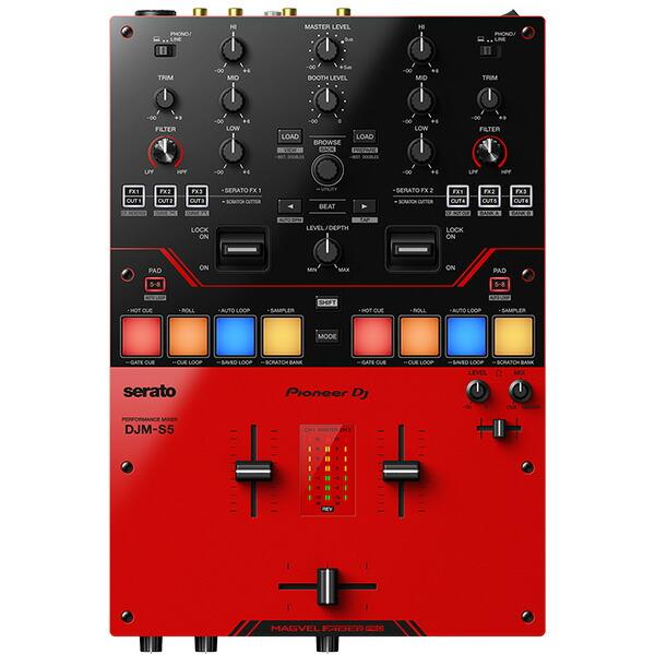 グロスレッドカラーが印象的な「Serato DJ Pro」対応のスクラッチスタイル2ch DJミキサー「DJM-S5」。プロフェッショナル仕様のレイアウトで、これからバトルDJのような本格的なDJプレイを始めたい方やテクニックを向上したい方に最適なDJミキサーです。