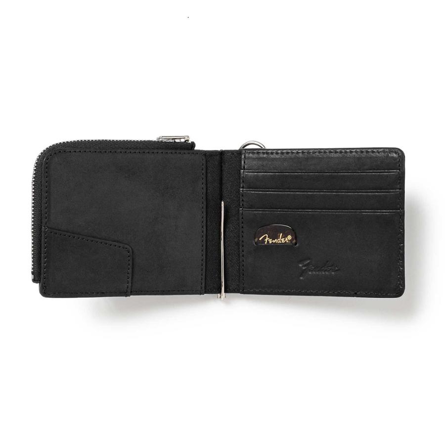 エレキギター界のトップブランドである「Fender」からライフスタイルに溶け込むアイテムが展開。国産のヌメ革を使用したマネークリップ。FenderのストラップをイメージしたウォレットコードとFenderのギターピックが付属し、ギターピックは収納可能。Fenderを愛する人々に贈る、遊び心とこだわりを詰め込んだアイテム。