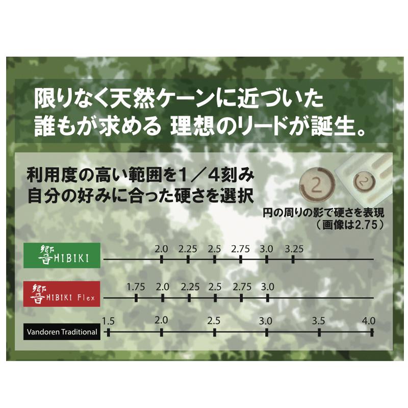 フォレストーンの新素材リード「響 Flex(ヒビキ・フレックス)」は、6年の開発期間を経て誕生した新しいリードです。高い品質と一貫性を備え、従来の製品に比べて優れた音響特性と演奏性を実現しています。