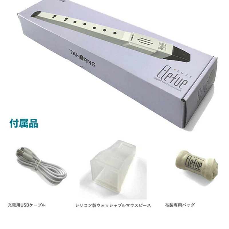 エレフエはどなたでも手軽に演奏を楽しむことができる電子リコーダーです。リコーダーをはじめ、サックスやクラリネットなど、10種類の音色を搭載し、ソプラノリコーダーと同じ運指で演奏を行うことができます。 本体にバッテリーとスピーカーを内蔵しているため、ケーブルレスでお使いいただける他、ヘッドフォン端子も装備しているため夜間の練習にも最適です。また、BluetoothによるワイヤレスMIDI機能も搭載しており、BLE-MIDI対応機器と接続することで外部音源をエレフエからコントロールすることも可能です。 《主な特徴》 ● ポータブルかつ洗練されたデザイン ● 取り外しが可能なシリコン製マウスピースを採用 ● 10種類の内蔵音色 ● 2種類の運指を搭載(バロック式/ジャーマン式) ● 3段階のブレス感度調整機能を搭載 ● トランスポーズ機能を装備 ● ワイヤレスMIDI機能を搭載 ● ヘッドフォン端子を装備 ● 800mAhの充電式リチウムイオンバッテリーを搭載 《内蔵音色》 1 ソプラノリコーダー 2 ひょうたん笛(フルス) 3 テナーサックス 4 アルトサックス 5 ソプラノサックス 6 バンブーフルート 7 フルート 8 クラリネット 9 トランペット 10 スオナ・チャルメラ 《仕様》 ・音色:10音色 ・運指モード:1 rリコーダーモード(ジャーマン式/バロック式)・2 Sシンプルモード) ・音域:リコーダーモード(C4からD6) シンプルモード(C3からC6) ・キートランスポーズ:±12半音 ・本体材質:ABS樹脂 ・ブレス感度:3段階 ・端子:ヘッドホン/ライン出力、マイクロUSB-Bタイプ ・電源:5V-USB電源。充電式リチウム電池内蔵。フル充電で3時間演奏可能 ・寸法:32.2 x 3.3 x 2.6 cm ・箱寸法:35.4 x 9.0 x 4.6 cm ・本体重量:105g ・付属品:シリコン製ウォッシャブルマウスピース、マイクロUSB-Bケーブル、布製バッグ、日本語取扱説明書、運指表