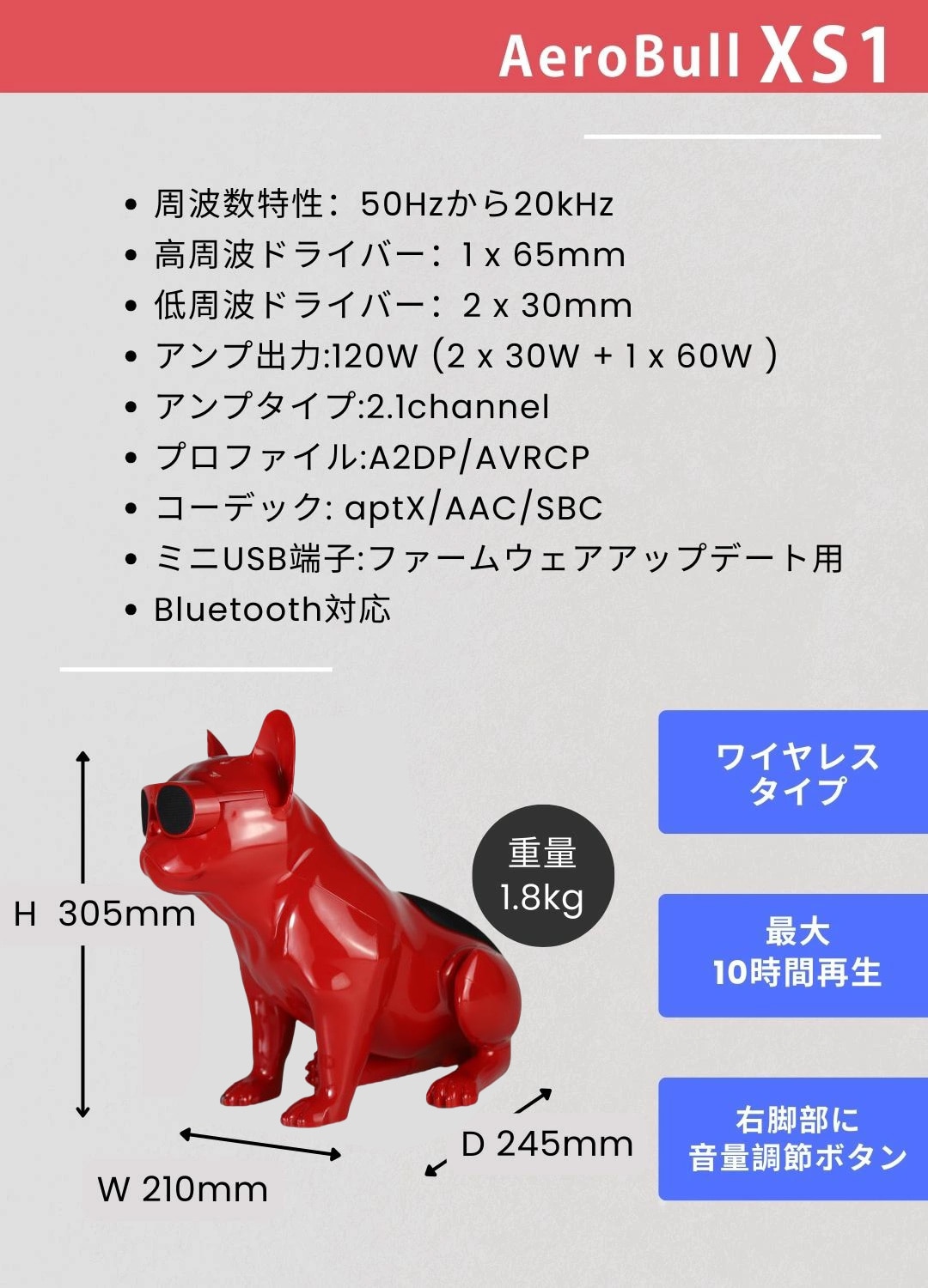 【可愛くスタイリッシュなモデルが奏でる極上サウンド。フランス発のフレンチブルドッグ型ワイヤレススピーカー】 ●ブランド紹介 フランスの AeroSystem Company と、エレクトロ・ミュージックのパイオニアとして知られる シンセサイザー奏者 Jean Michel Jarre(ジャン・ミッシェル・ジャール) によって、2005年に創業されたサウンドブランドです。 機能性とデザイン性を追求したユニークなスピーカーを通じて、五感を魅了する感動体験をお届けすることを目標としています。 《商品特徴》 ●想像を超えるサウンド まるで巨大な犬の咆哮が体中から響き渡るような機能性とデザイン性を追求した最もユニークなスピーカーAeroBullシリーズ。 ●一度見たら忘れられないユニークなデザイン 大胆なデザインと卓越した音響システムがもたらす比類のないスタイル。 ご自宅のインテリアや、オフィス・ラウンジ・レストラン・バーなどの空間を彩ります。 ●小型ながらパワフルなサウンド 小型ながら、2.1chアンプと、120Wの出力で想像を超えるパワフルなサウンドを提供 ●軽量で持ち運び可能 サイズ30cm、軽量なフレームのためどんな場面にも持っていくことができます。 ●最大10時間の連続再生 ●TrueWireless機能 2台のAeroBullを使って、ワイヤレスステレオペアリングにも対応。 さらに迫力のあるサウンドへ。 《仕様》 ・ワイヤレスタイプ ・右脚部に音量調節ボタンあり ・ミニUSB端子:ファームウェアアップデート用 サウンド ・アンプ出力:120W (2x30W + 1x60W) ・アンプタイプ:2.1channel ・周波数特性:50Hzから20kHz ・高周波ドライバー:1 x 65mm ・低周波ドライバー:2 x 30mm バッテリー ・フル充電時の連続再生時間:最大10時間 ・充電タイプ:専用アダプタ Bluetooth ・ワイヤレス:有 ・Bluetoothバージョン:5.3 ・通信範囲:10m ・プロファイル:A2DP/AVRCP ・コーデック: aptX/AAC/SBC 本体サイズ ・H305×W210×D245 (mm) ・重量:1.8 kg