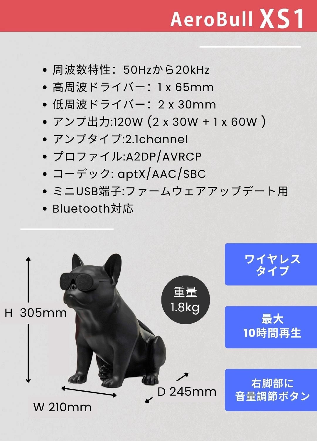 【可愛くスタイリッシュなモデルが奏でる極上サウンド。フランス発のフレンチブルドッグ型ワイヤレススピーカー】 ●ブランド紹介 フランスの AeroSystem Company と、エレクトロ・ミュージックのパイオニアとして知られる シンセサイザー奏者 Jean Michel Jarre(ジャン・ミッシェル・ジャール) によって、2005年に創業されたサウンドブランドです。 機能性とデザイン性を追求したユニークなスピーカーを通じて、五感を魅了する感動体験をお届けすることを目標としています。 《商品特徴》 ●想像を超えるサウンド まるで巨大な犬の咆哮が体中から響き渡るような機能性とデザイン性を追求した最もユニークなスピーカーAeroBullシリーズ。 ●一度見たら忘れられないユニークなデザイン 大胆なデザインと卓越した音響システムがもたらす比類のないスタイル。 ご自宅のインテリアや、オフィス・ラウンジ・レストラン・バーなどの空間を彩ります。 ●小型ながらパワフルなサウンド 小型ながら、2.1chアンプと、120Wの出力で想像を超えるパワフルなサウンドを提供 ●軽量で持ち運び可能 サイズ30cm、軽量なフレームのためどんな場面にも持っていくことができます。 ●最大10時間の連続再生 ●TrueWireless機能 2台のAeroBullを使って、ワイヤレスステレオペアリングにも対応。 さらに迫力のあるサウンドへ。 《仕様》 ・ワイヤレスタイプ ・右脚部に音量調節ボタンあり ・ミニUSB端子:ファームウェアアップデート用 サウンド ・アンプ出力:120W (2x30W + 1x60W) ・アンプタイプ:2.1channel ・周波数特性:50Hzから20kHz ・高周波ドライバー:1 x 65mm ・低周波ドライバー:2 x 30mm バッテリー ・フル充電時の連続再生時間:最大10時間 ・充電タイプ:専用アダプタ Bluetooth ・ワイヤレス:有 ・Bluetoothバージョン:5.3 ・通信範囲:10m ・プロファイル:A2DP/AVRCP ・コーデック: aptX/AAC/SBC 本体サイズ ・H305×W210×D245 (mm) ・重量:1.8 kg