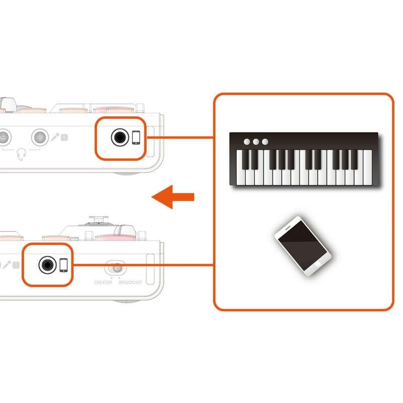 iPhone配信でも手軽にボイスエフェクトやリバーブなど音声効果のある高音質配信が可能です。 ※接続にはApple社製Lightning - USBカメラアダプタ(別売)が必要です。 ※MicroUSBケーブル(別売)およびが外部からの電源供給が必要です。