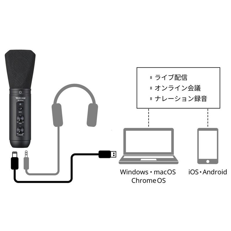 業界標準のUSB Type-C端子を搭載し、Windows/ macOS/iOS/iPadOS/Android*/Chrome OS*など、USBクラスコンプライアント機器に対応しています。ドライバーのインストールは不要ですぐに接続でき、オンラインミーティングやライブ配信に最適な16bit/48kHzに対応しています。
