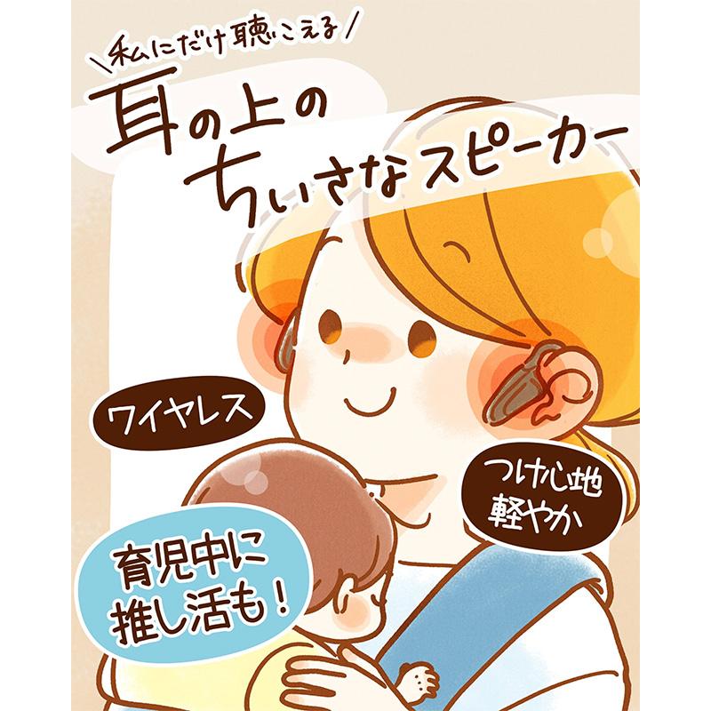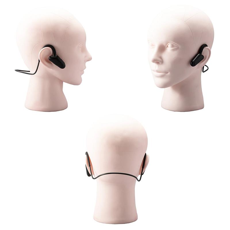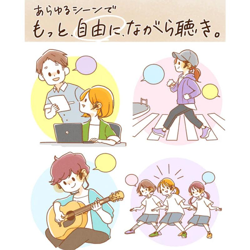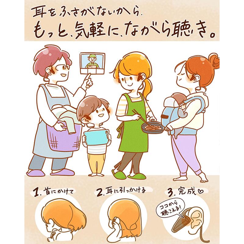 耳をふさがない構造のため、周りの音がそのまま聴こえ、家族や同僚からの呼びかけ、来客時のインターホンにも気付けます。また、耳穴への負担が構造上なく、外耳炎などのリスクもありません。さらに、骨伝導イヤホンのように左右から押さえつける力(側圧)が不要なので、長時間の装着も快適です。