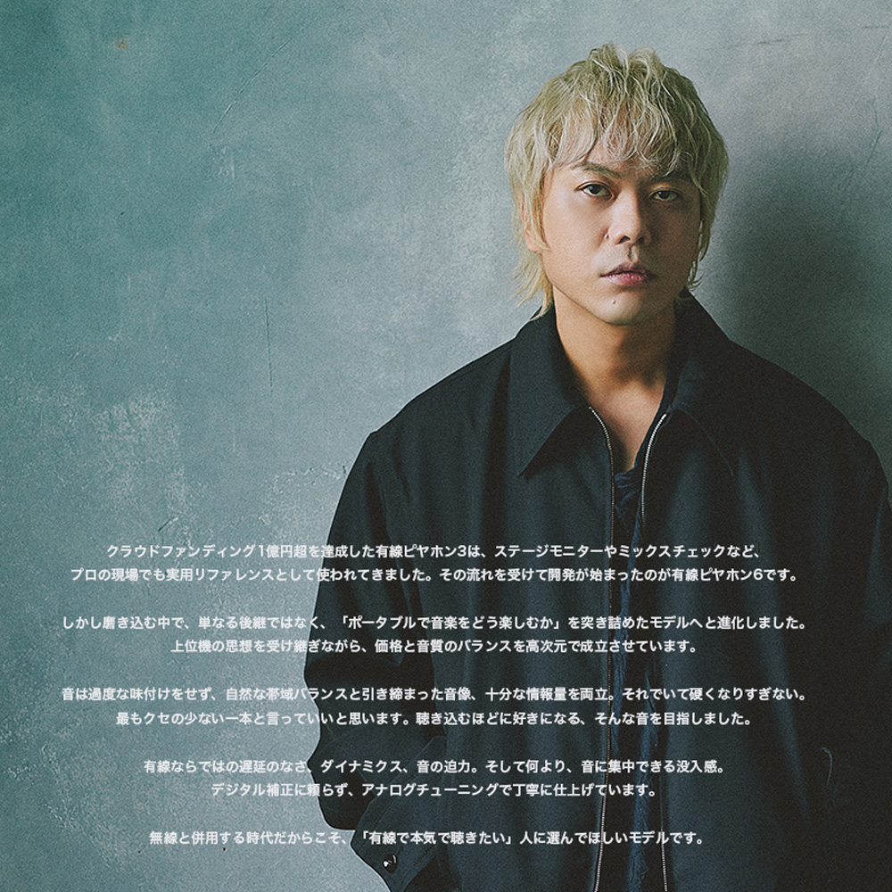 クラウドファンディング1億円超を達成した有線ピヤホン3は、ステージモニターやミックスチェックなど、プロの現場でも実用リファレンスとして使われてきました。その流れを受けて開発が始まったのが有線ピヤホン6です。