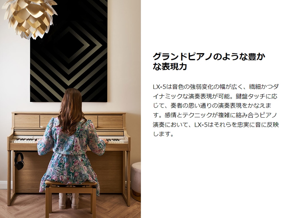 LX-5は音色の強弱変化の幅が広く、繊細かつダイナミックな演奏表現が可能。鍵盤タッチに応じて、奏者の思い通りの演奏表現をかなえます。感情とテクニックが複雑に絡み合うピアノ演奏において、LX-5はそれらを忠実に音に反映します。