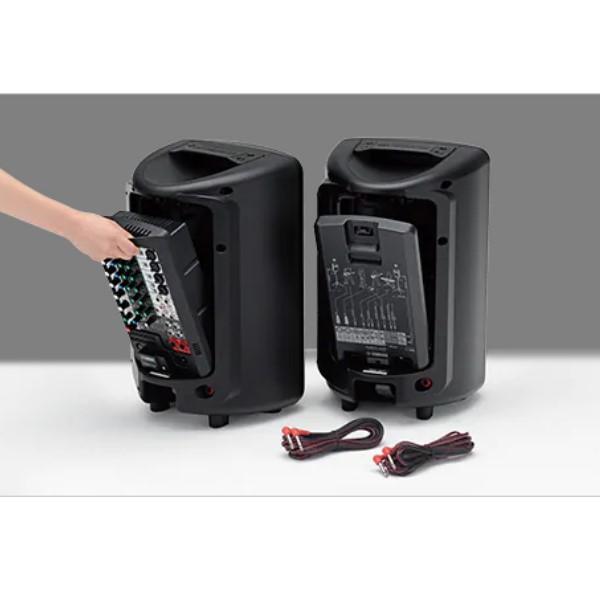 STAGEPASシリーズは着脱式のパワードミキサーと2本のスピーカーからなるポータブルなオールインワンシステム。