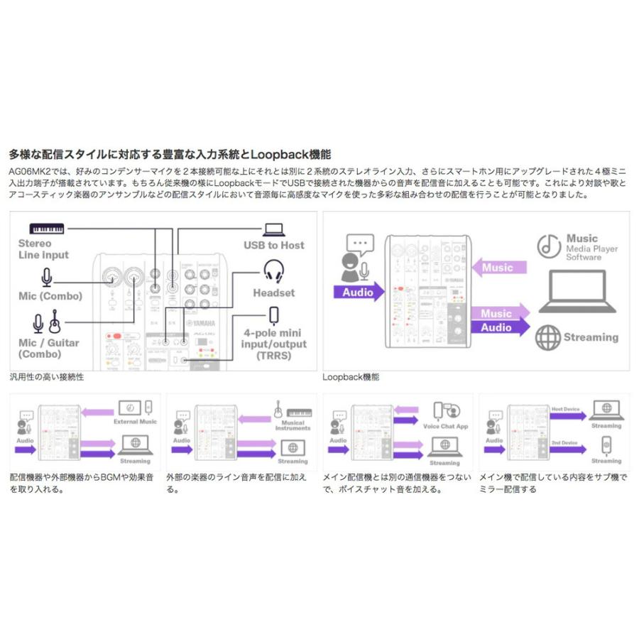 AG06MK2では、好みのコンデンサーマイクを2本接続可能な上にそれとは別に2系統のステレオライン入力、さらにスマートホン用にアップグレードされた4極ミニ入出力端子が搭載されています。もちろん従来機の様にLoopbackモードでUSBで接続された機器からの音声を配信音に加えることも可能です。これにより対談や歌とアコースティック楽器のアンサンブルなどの配信スタイルにおいて音源毎に高感度なマイクを使った多彩な組み合わせの配信を行うことが可能となりました。