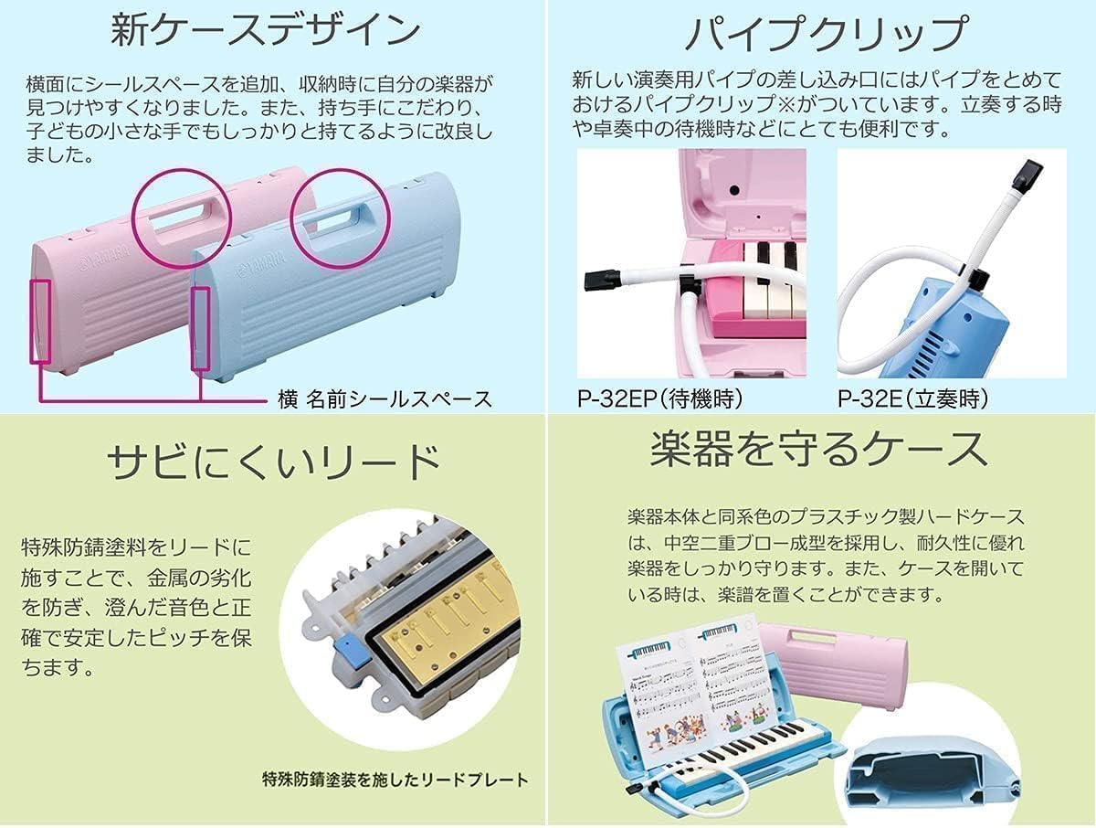 ひときわ澄んだ音色と美しい集合音で、音量も豊かです。音域も広く、低ー高学年まで多様に活用できます。子どもたちの使い勝手を追求した新しいデザインで、さわやかなブルーのカラーを採用したモデルです。(鍵盤数:32鍵、色:ブルー) [概要] 旋律の演奏は、息のコントロールで表情豊かに!和音の学習は目で確かめながら!吹奏楽器と鍵盤楽器の特性を両方持ち合わせたピアニカは、クリアな音色が人気で、音楽を奏でる喜びや、表現することの楽しさを感じさせてくれる楽器です。 [特徴] [便利なパイプクリップ] 新しい演奏用パイプの差し込み口にはパイプを留めておけるパイプクリップ(特許出願中)がついています。手持ち時の演奏や卓奏の待機時などにとても便利です。 [便利なシールスペース] 新デザインハードケースには、背面と横面に名前シールを貼るスペースを設けているので、ロッカーに入れた時などに自分のピアニカを探す際にとても便利です。 [持ち手の形状を改良] ハードケースにはやさしいイメージの新しい形状を採用。子どもの小さな手でも持ちやすいよう、持ち手の形状を改良しました。 [息漏れを防ぐ構造] 継ぎ目のないスポンジゴム製の「フレームパッキン」と薄紙製の「プレートパッキン」を採用したこだわりの構造で、息漏れを徹底的に防止しています。 [さびにくいリード] 特殊防錆塗料をリードに施すことで金属の劣化を防ぎ、澄んだ音色と正確で安定したピッチを保ちます。 [スムーズなタッチ感] 鍵盤の長さ、重さが異なる白鍵と黒鍵には、それぞれに専用のバネを使用しています。鍵盤下にはブレ防止ガイドも備わり、自然でスムーズなタッチ感を実現しています。 [楽器を守るケース] 楽器本体と同系色のプラスチック製ハードケースは、中空二重ブロー成型を採用し、耐久性に優れ楽器をしっかり守ります。また、ケースを開いているときは、楽譜を置くことができます。 [色/仕上げ] 本体 色 ブルー [サイズ/重量] 寸法 幅 本体:425mm、ケース:456mm 高さ 本体:49mm、ケース:58mm 奥行き 本体:96mm、ケース:173mm 重量 重量 600g(ケースは含まない) 鍵盤 鍵盤数 32 音源音域 f- c