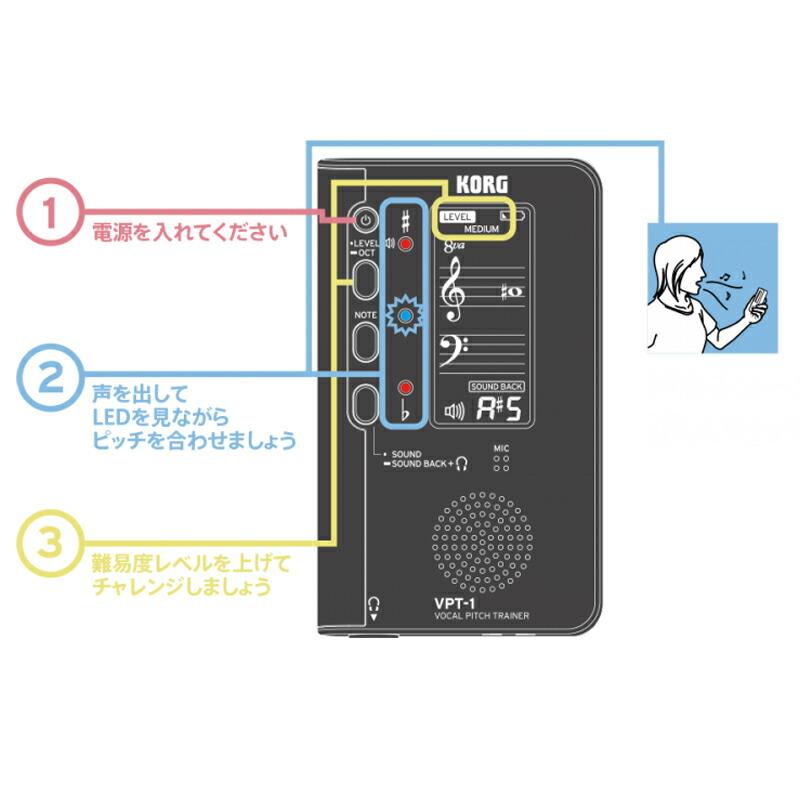 聞こえ方の違いだけでなくピッチも意識し、チューナーでしっかり確認して感覚を磨く。多くの楽器では当たり前のことをボーカル・レッスンにも取り入れてみましょう。VPT-1は40年以上もの間、ミュージシャンから絶大な信頼を得ているチューナーを作ってきたコルグがそのノウハウをフルに発揮して作った、ボーカル専用ピッチ・トレーナーです。