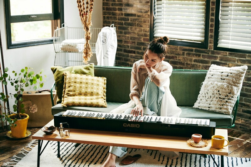 Privia PX-S1100の大きな特徴のひとつがスリムなボディ。ハンマーアクション付き88鍵盤搭載のデジタルピアノとしては世界最小です※。奥行き232mmというサイズは、リビングや寝室など、好きな場所に置くことができ、ピアノとの生活をもっと楽しめます。