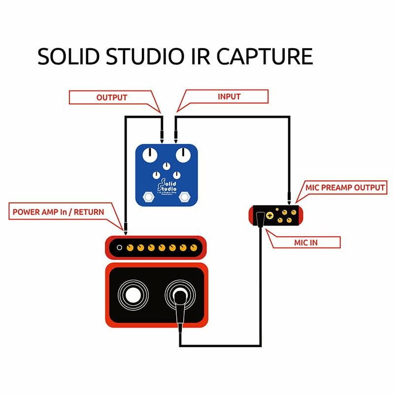 IR(インパルスレスポンス)ファイルをSolid Studioにロードすることで簡単に好みのキャビネットのサウンドを取り込むことも可能です。さらに、好みのアンプからIRファイルを作る事ができるIRキャプチャー機能を搭載。マイクロフォンをスピーカーの前にセットし キャプチャー。オリジナルのIRファイルを作成、プリセットに保存する事が可能です。