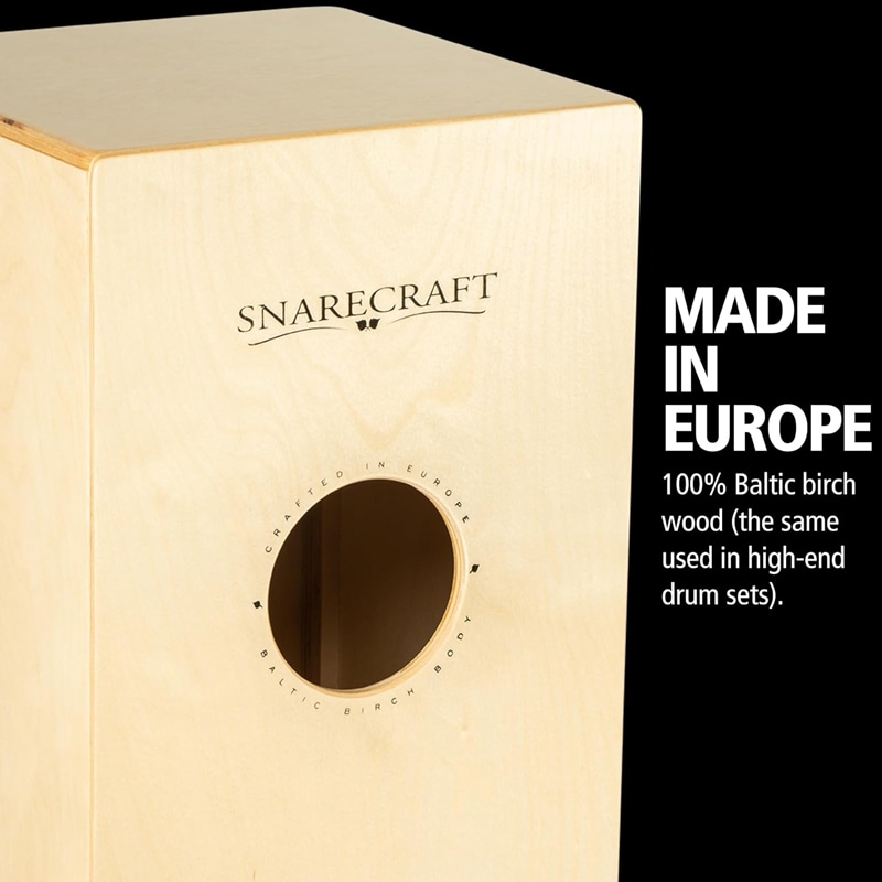 Snarecraft カホンは、クリスピーなスネアと暖かい音質を兼ね備えています。内部にセットされた2セットのワイヤーと隠し味のストリングスによって、絶妙にブレンドされた素早いレスポンスのスネアと、バルティックバーチを使用したボディーから出るパンチの効いた低音が幅広いダイナミックレンジを提供します。また、上部の丸く削られたコーナーは演奏時のタッチに最大限の快適さを与えます。
