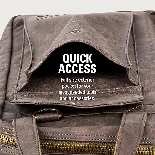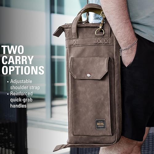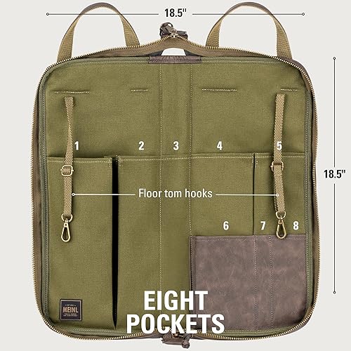 スティックやマレット、ブラシを整理して収納可能な仕切り付のメインポケットの他、短めや小型のアクセサリを収納可能なレザー調の浅いポケットを装備しています。大きめに取られたスナップ式の外側ポケットへは、アクセサリやツールを収納できます。長さ調整可能なフロアタムセッティング用ストラップ&金属製フック、また肩掛けはバッグの前後ろでセットできるようなポジションとなっており、運搬時に体へフィットするデザインとなっています。
