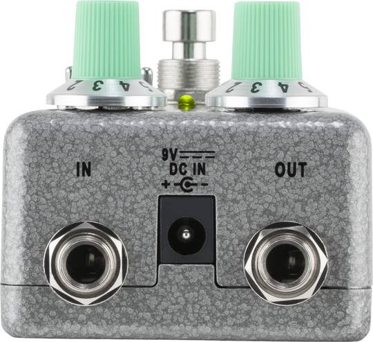 堅牢度の高いシルバーの 4.375” x 2.375” x 1.25”サイズの筐体にはペダルボード上での使用を想定し、インプット/アウトプットのジャックを上部にまとめるという工夫が成されています。