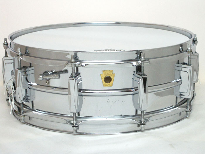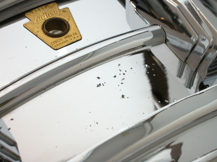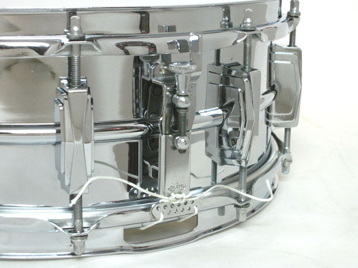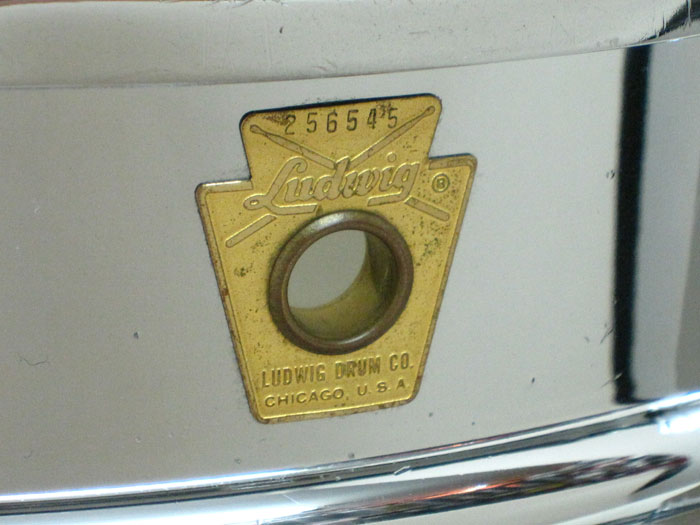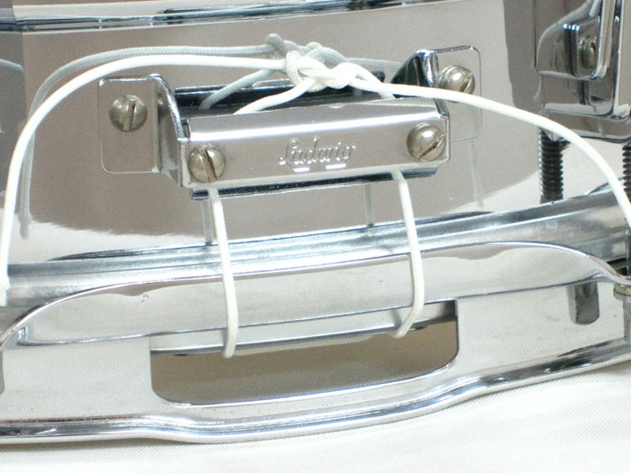 年代はシリアルナンバー(256545)キーストーンバッジ装着。マフラースイッチは60年代製のベースボールバットスイッチ(白フェルト)。恐らく65年製の物と思われます。ストレイナースイッチは60年代のP-83装着で、スナッピーのオンオフはかなりスムーズです。年代の過渡期なのかトップのみがクロムオーバーブラスフープのLudwigオリジナルが装着されています。ボトムは60年代のスティール製フープです。