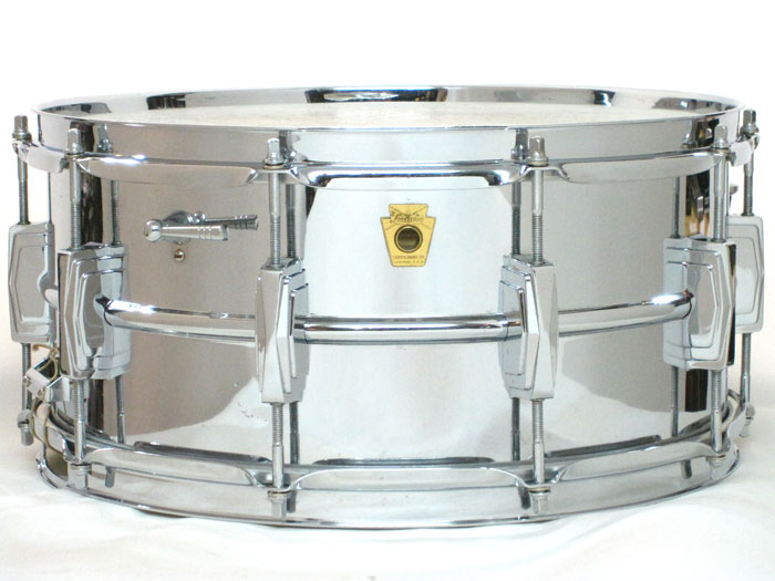 シェルマテリアルは勿論ながらラディアロイ(アルミ合金)を使用。エンブレムキーストーンバッジ、ストレイナースイッチは60年代P-83のタイプ、フープはラディック60s当時の純正品。内蔵マフラーはベースボールバット(赤フェルト)でオリジナルでございます。 バット部は60s P-32を搭載し、止めネジも生きています。またフープはブラス製の純正フープが装着されており、甘く太いリムサウンドを得られます。