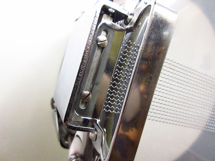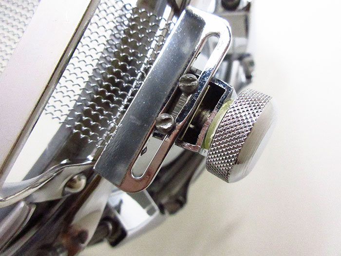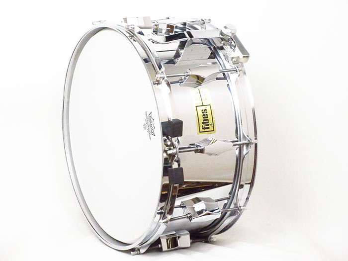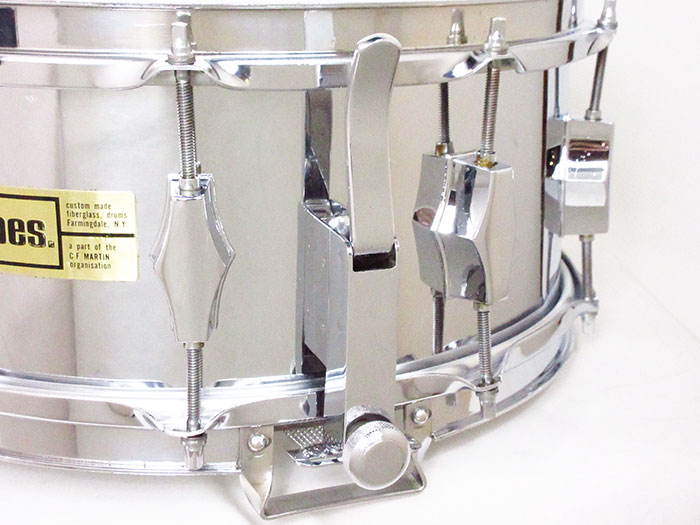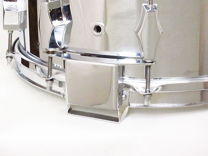 剛性の高いFiberglass材にクロームのカバリングを施したモデルで全面ワイヤーにトリプルフランジフープが装着しております。音量も非常に大きく硬質でアタック重視なサウンドでありながらビンテージ特有のふくよかさを兼ね備えておりあまり珍しいサウンドであると思われます。