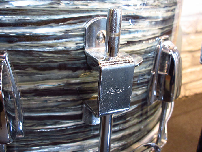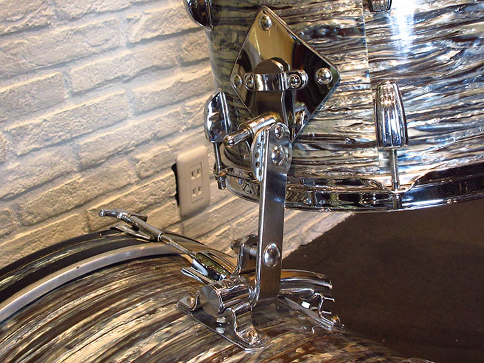 タム、フロアタムのフープ上下ともオリジナルのブラスフープ、タムブラケットはP-1672の前身で#782というタイプでビンテージグレッチと同様のシステムとなっています。タムレールマウント部も健在で可動しております。フロアタムブラケットもクリッパーのスプリングロードブラケットで、CLUB DATEモデル等に使用されていたものとなっています。