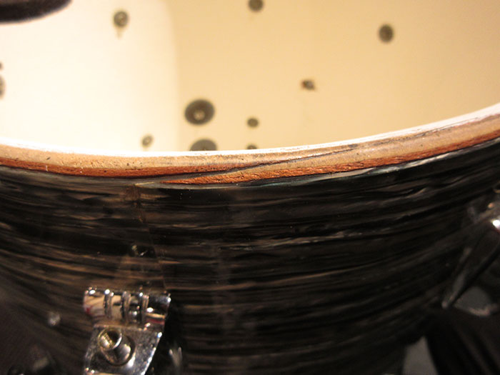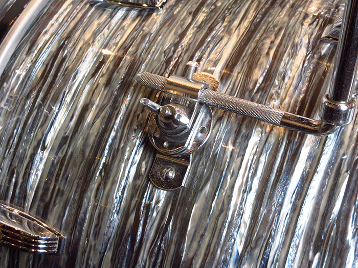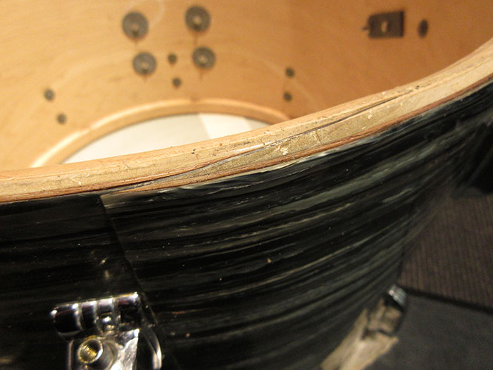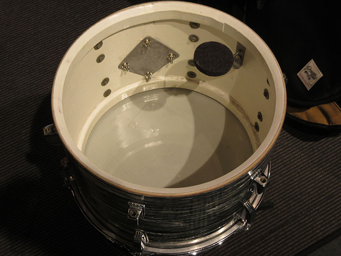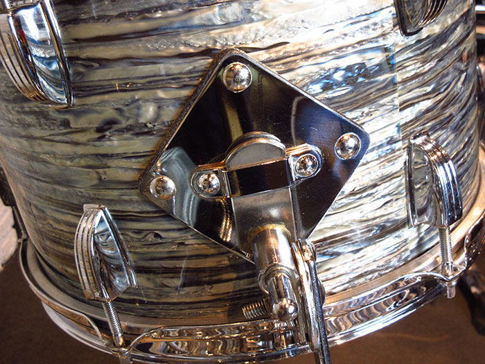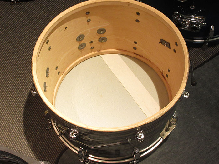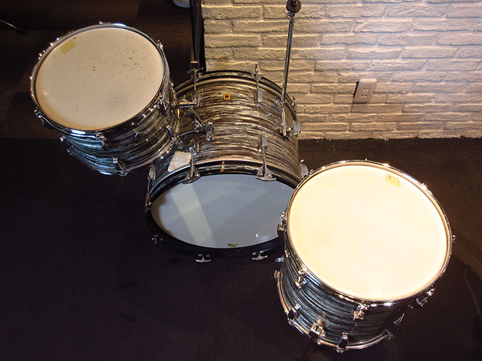 カバリングの状態は良好で浮き上がった部分や張合わせが剥がれるような部分などはございません。レインフォースメントの割れも無くシェル自体がきれいに残っています。また62,3年までにみかけられるバスドラム内側はホワイトコートされていません。またメイプル、ポプラシェルとなっております。
