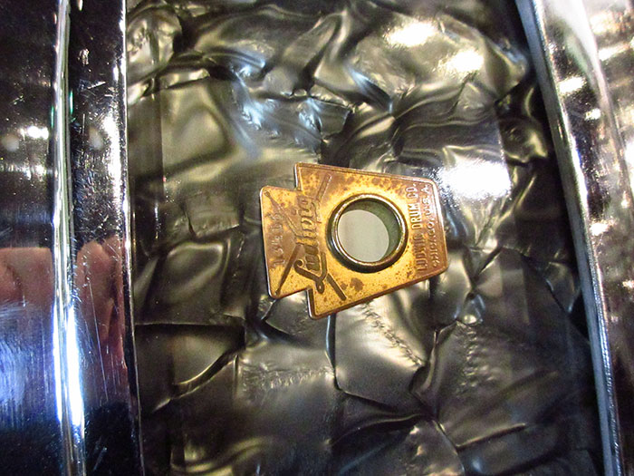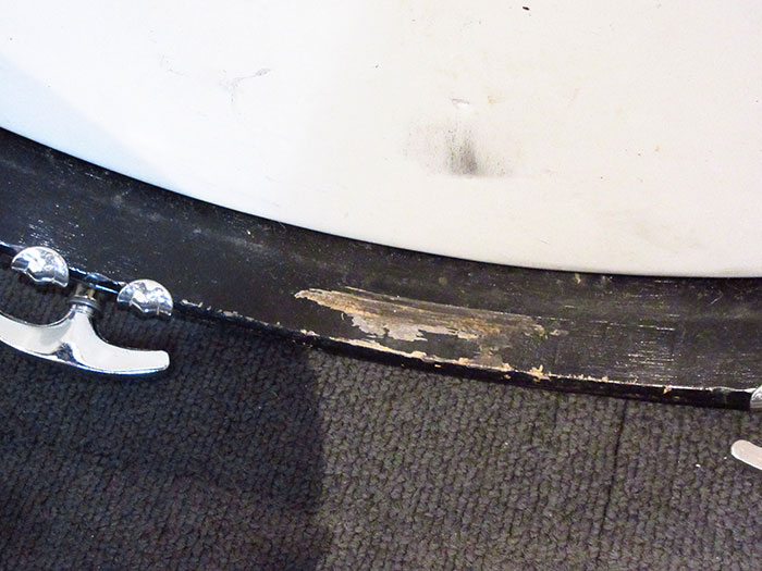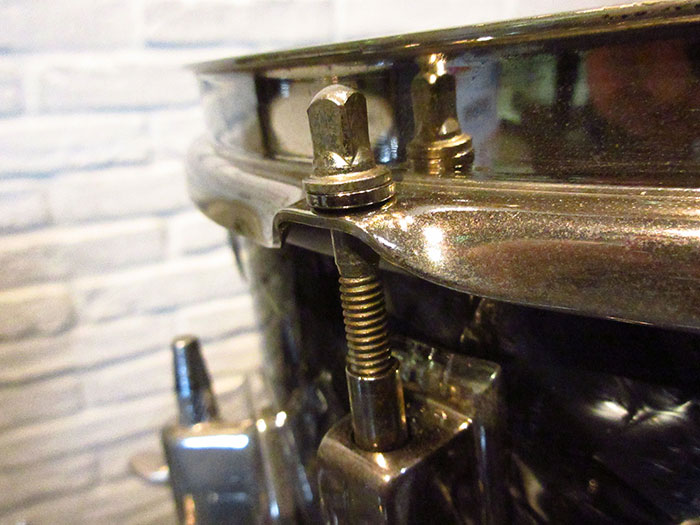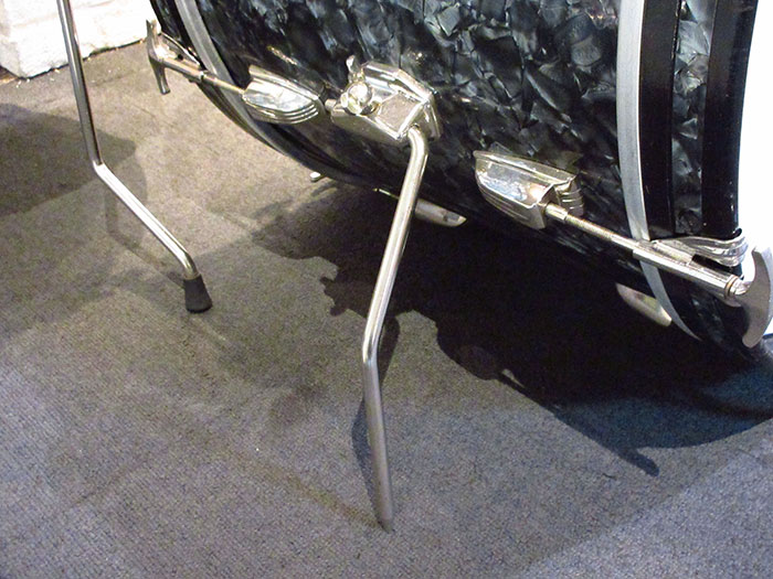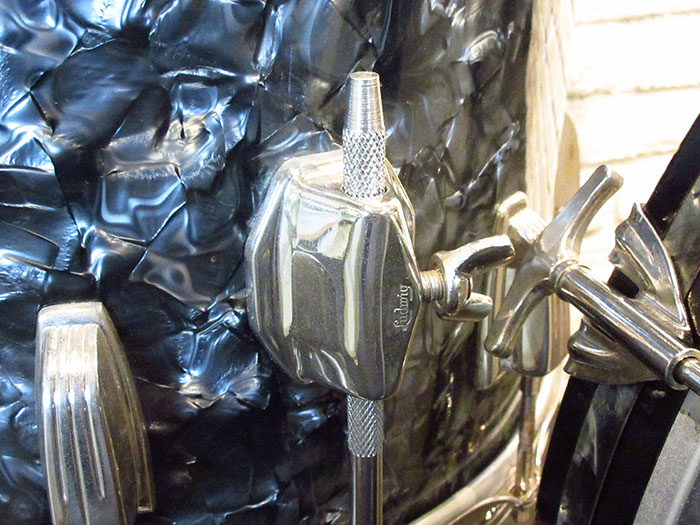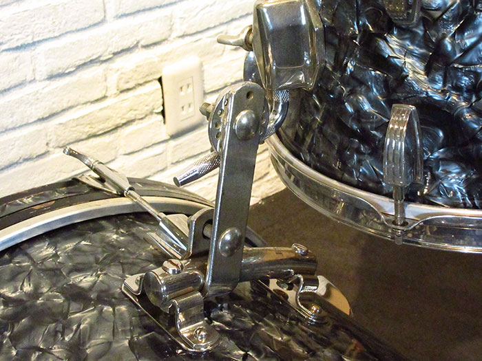 タム、フロアタムのフープはオリジナルのブラスフープ、またブラケット類は初期型の象徴とも言える通称クリッパー、1964年から65年にかけてのパーツ変更の過渡期かと思われます。タムレールマウント部も健在で可動しております。バスドラムレッグはオリジナルスパイダーが取り付けられています。