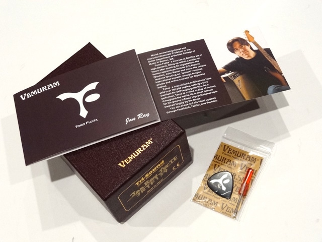 ギターからアンプに直接繋ぐときのナチュラルな音が一般的に"良い音"と言われますが、いわゆる"アン直"の場合歪ませようと思うとかなりの音量となってしまいます。そこで、多くのギタリストはペダルを繋ぐわけですが、トモ藤田氏が一番好きなペダルが、このVEMURAMのJan Rayでした。ギター、アンプの原音を全く変えないで、まるでアンプをフルにしたような自然なニュアンスのトーン、そして艶がある良いトーンが作れるJan Rayは彼のプレイで重要なポイントとなるピッキングニュアンスの表現の際ダイナミックスのレンジがかなり大きいため重宝されている様ですが、さらに双方の良さを活かす為に何度もモディファイが重ねられました。そして、この仕様が今回限定モデルとして製作されたのです。特に、ヴォリュームよりセンシテイヴになり、トーンはBassが抑えられ抜けのよいブライトなサウンドとなっている部分が特徴です。