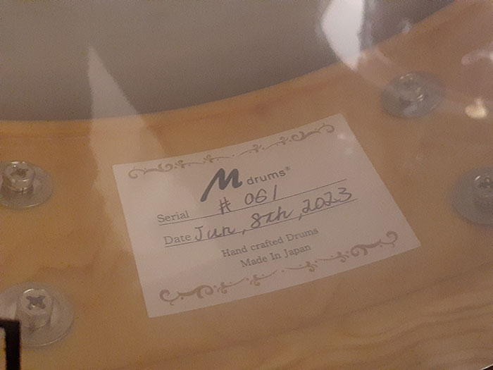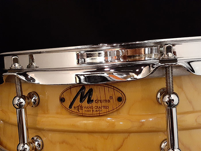 先日、Mdrumsファクトリーに直接伺いまして、工場内の数あるストックの中から特に気になりました個体の1台です。桧(ヒノキ)材の14"x4"浅胴スネアです。